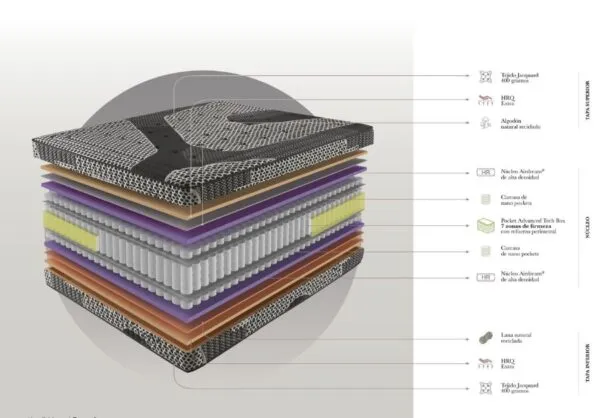 Núcleo de Airdream® de alta densidad con carcasa de nano pockets y Pocket Advanced Tech Box 7 zonas de firmeza, con doble tratamiento térmico para evitar la corrosión utilizando el 55% del acero reciclado.
