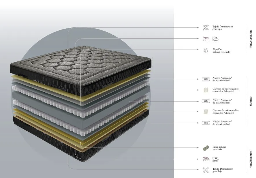 Tapa superior fabricada con tejido Damastretch de gran lujo, espuma HRQ Extra y algodón natural reciclado. Núcleo con doble carcasa de micromuelles ensacados Advanced y Airdream® de alta densidad.