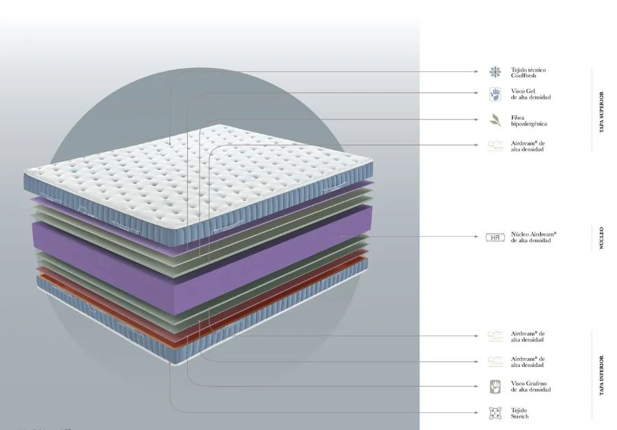 La tapa inferior con viscografeno termosensible de alta densidad ofrece todas las ventajas de este material de última generación, ayudando a liberar la electricidad estática del cuerpo y puntos depresión.