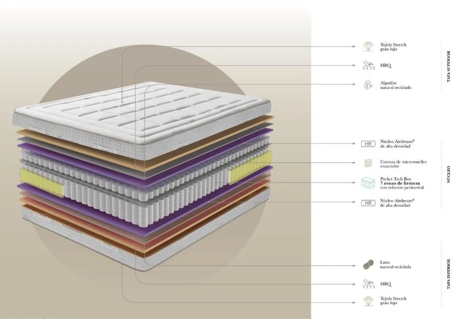 Un colchón con un confort exclusivo para proporcionar una comodidad única y un sueño reparador. Núcleo con Pocket Tech Box 7 zonas de firmeza, con doble tratamiento térmico para evitar la corrosión utilizando el 55% del acero reciclado.