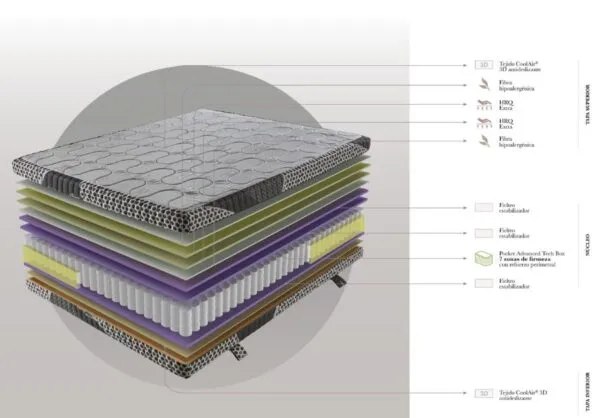 Núcleo con Pocket Advanced Tech Box 7 zonas de firmeza, con doble tratamiento térmico para evitar la corrosión utilizando el 55% del acero reciclado y doble fieltro estabilizador en la parte superior.