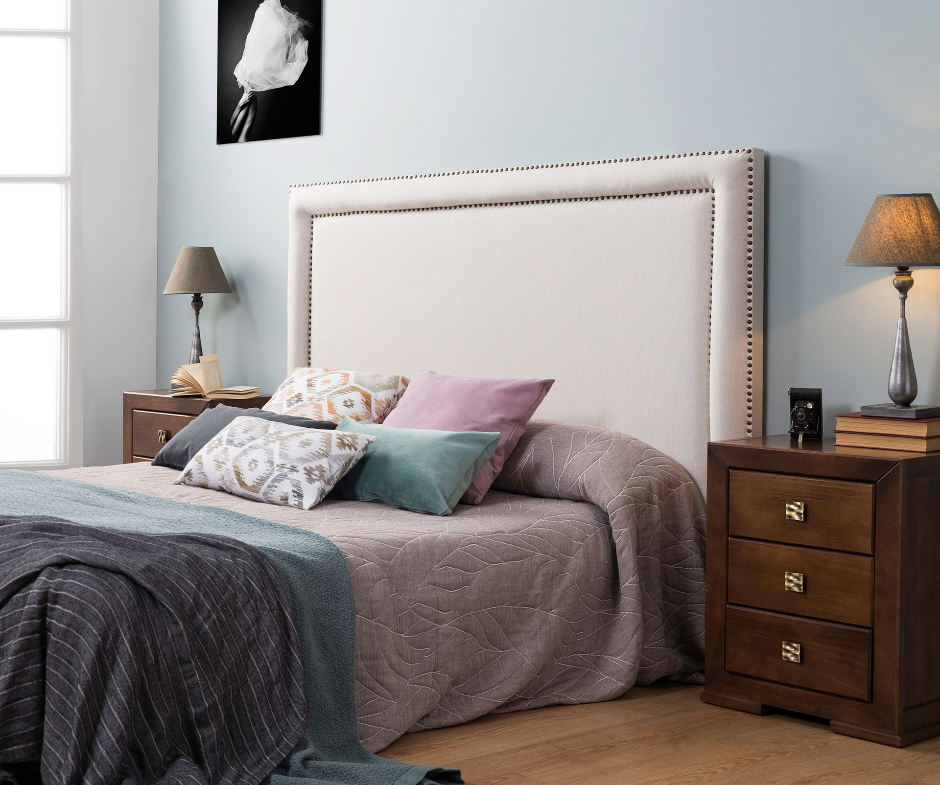 GDECO – PARA CAMA 150 CM -CABECERO TACHA DOBLE DORADA. TELA LINO MONET NATURAL