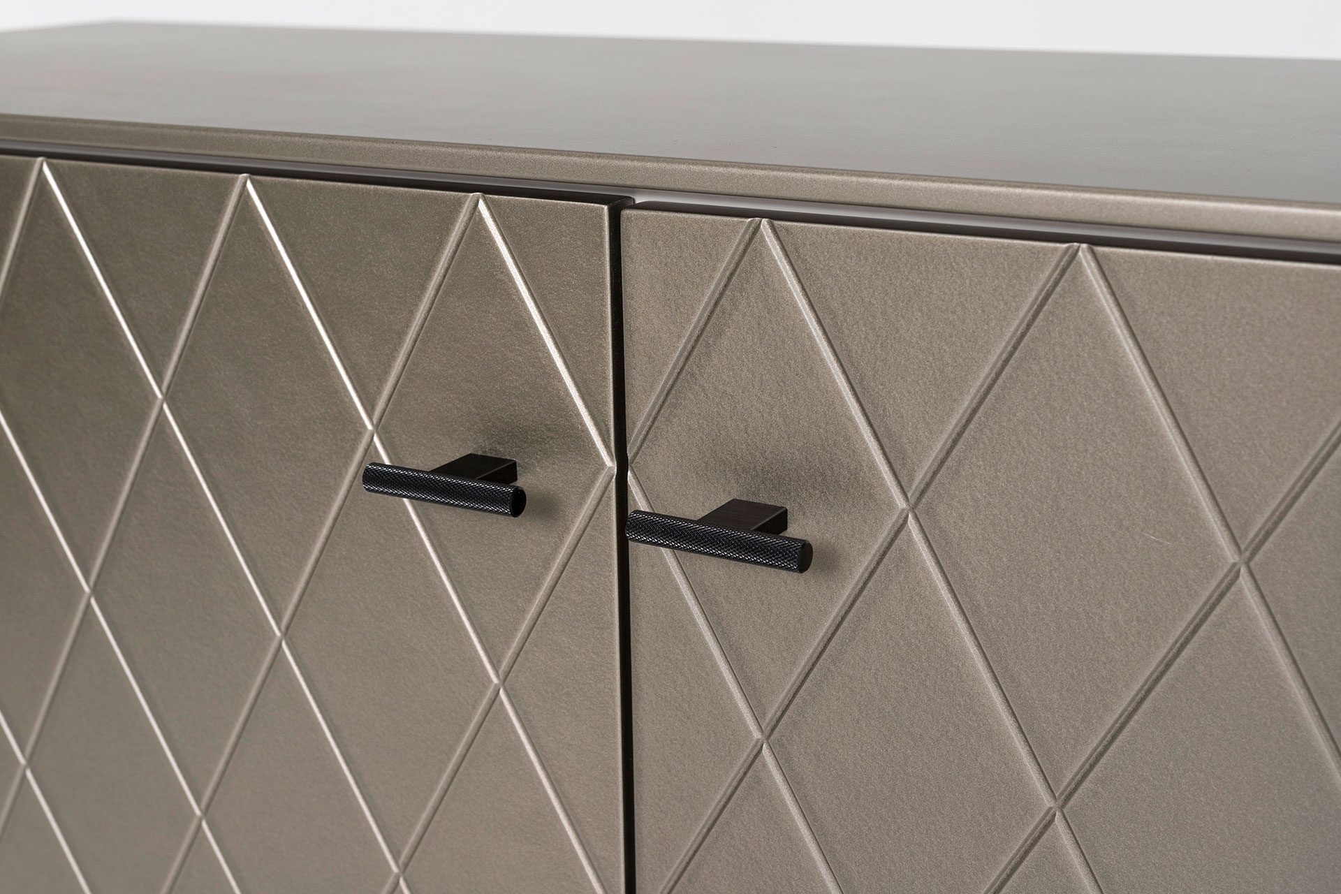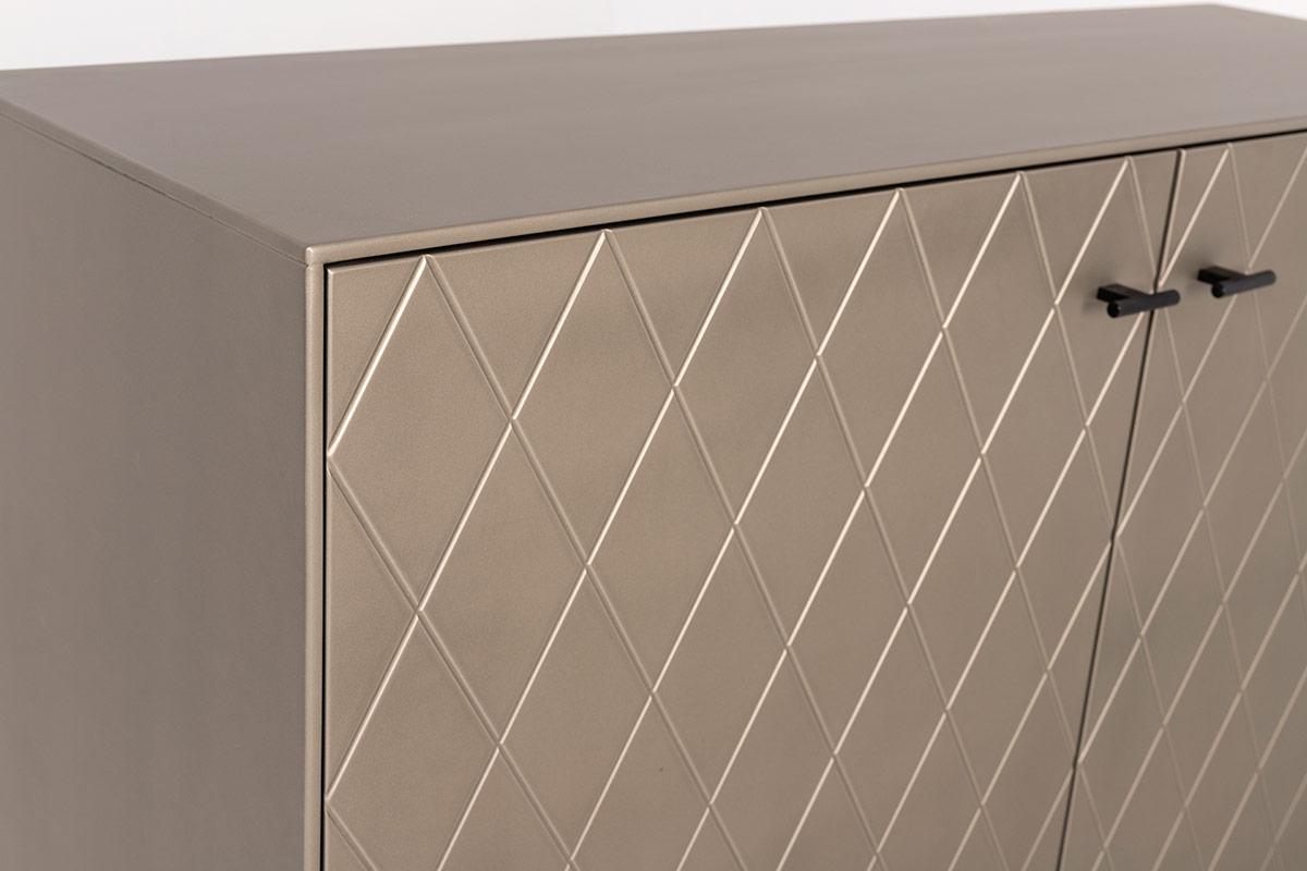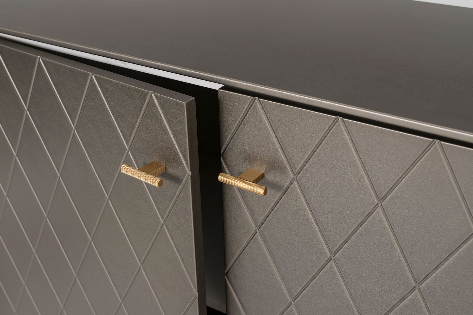 CONSOLA 2 PUERTAS. COLECCIÓN DIAMOND. LACADA ORO PERLADO, ZOCALO NEGRO GRAFITO. VISAGRA CON FRENO.