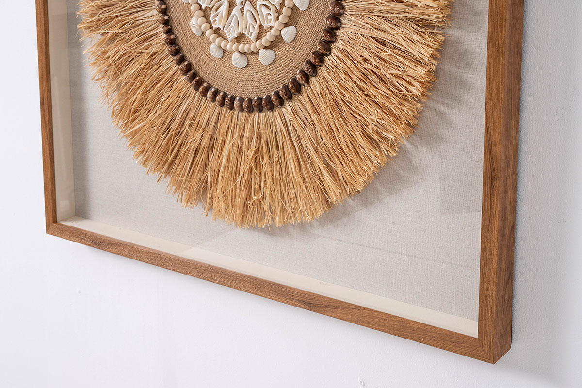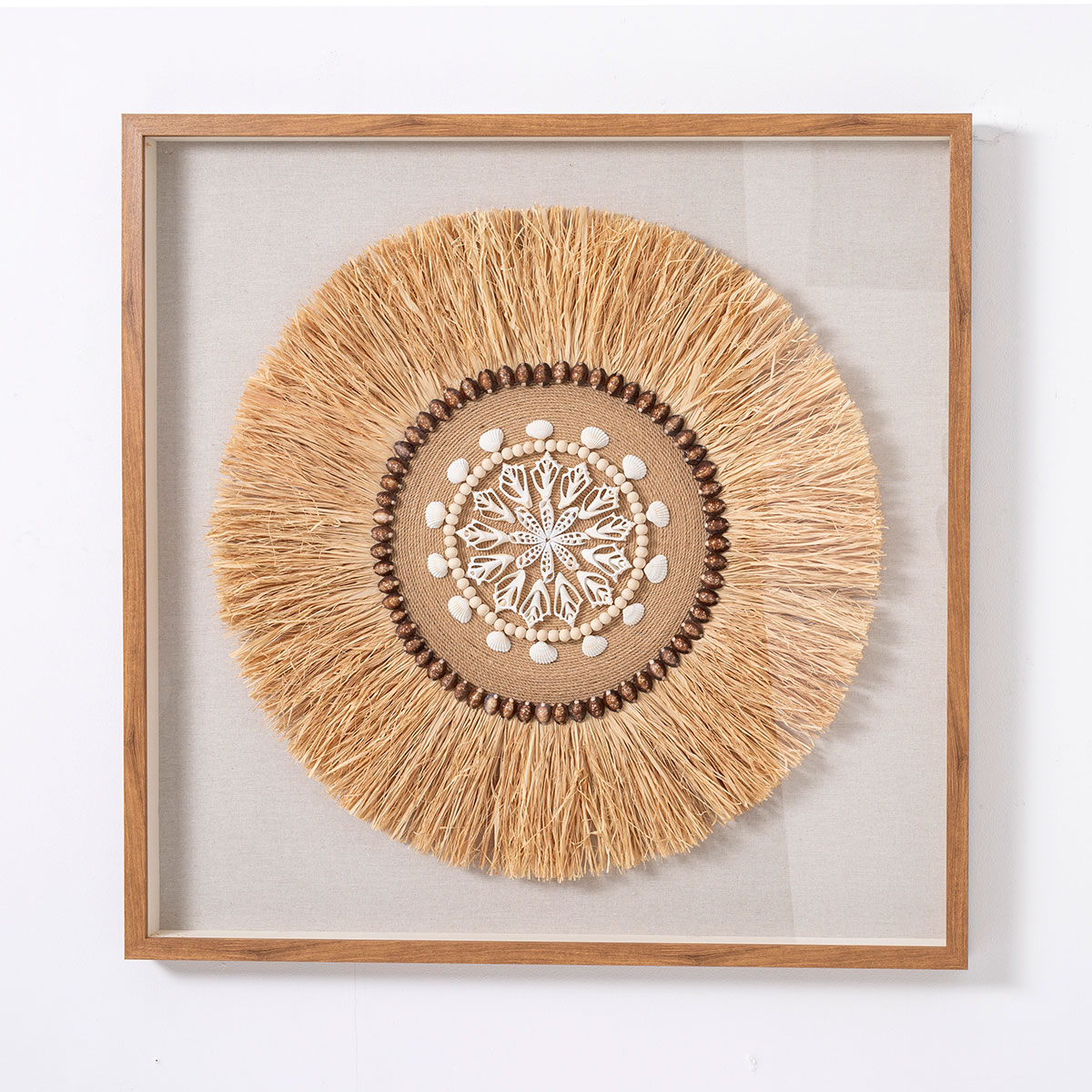 GDECO – CUADRO VITRINA 100*100 CM, MARCO ROBLE, ESCULTURA FIBRA NATURAL Y CONCHAS MARINAS