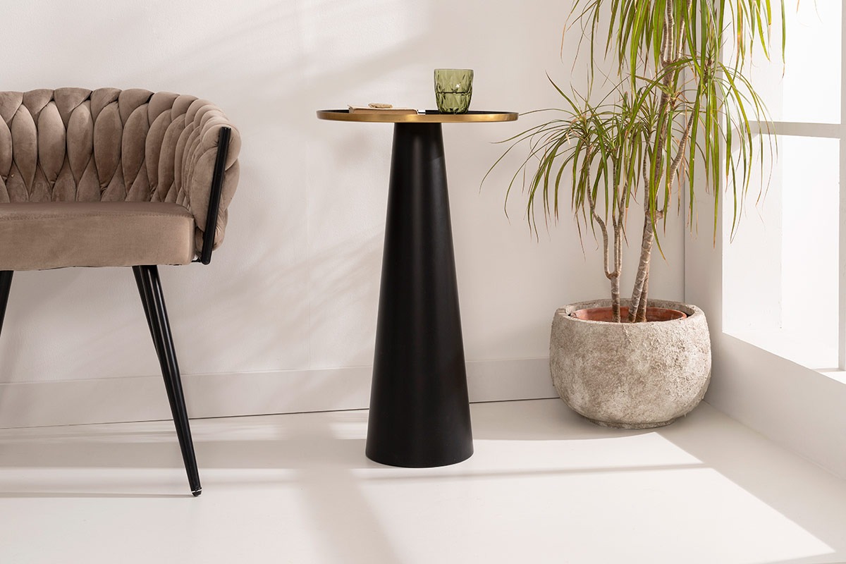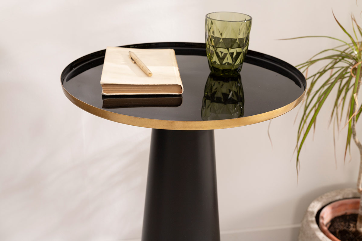 GDECO – MESA AUXILIAR 71*40*40 CM. BASE METAL ESMALTADO NEGRO CON RIBETE DORADO EN TAPA