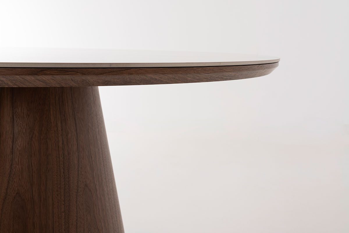GDECO – MESA COMEDOR REDONDA 120 CM. TAPA PORCELANICO BLANCO, PIE CHAPA NOGAL. ALTURA 76 CM