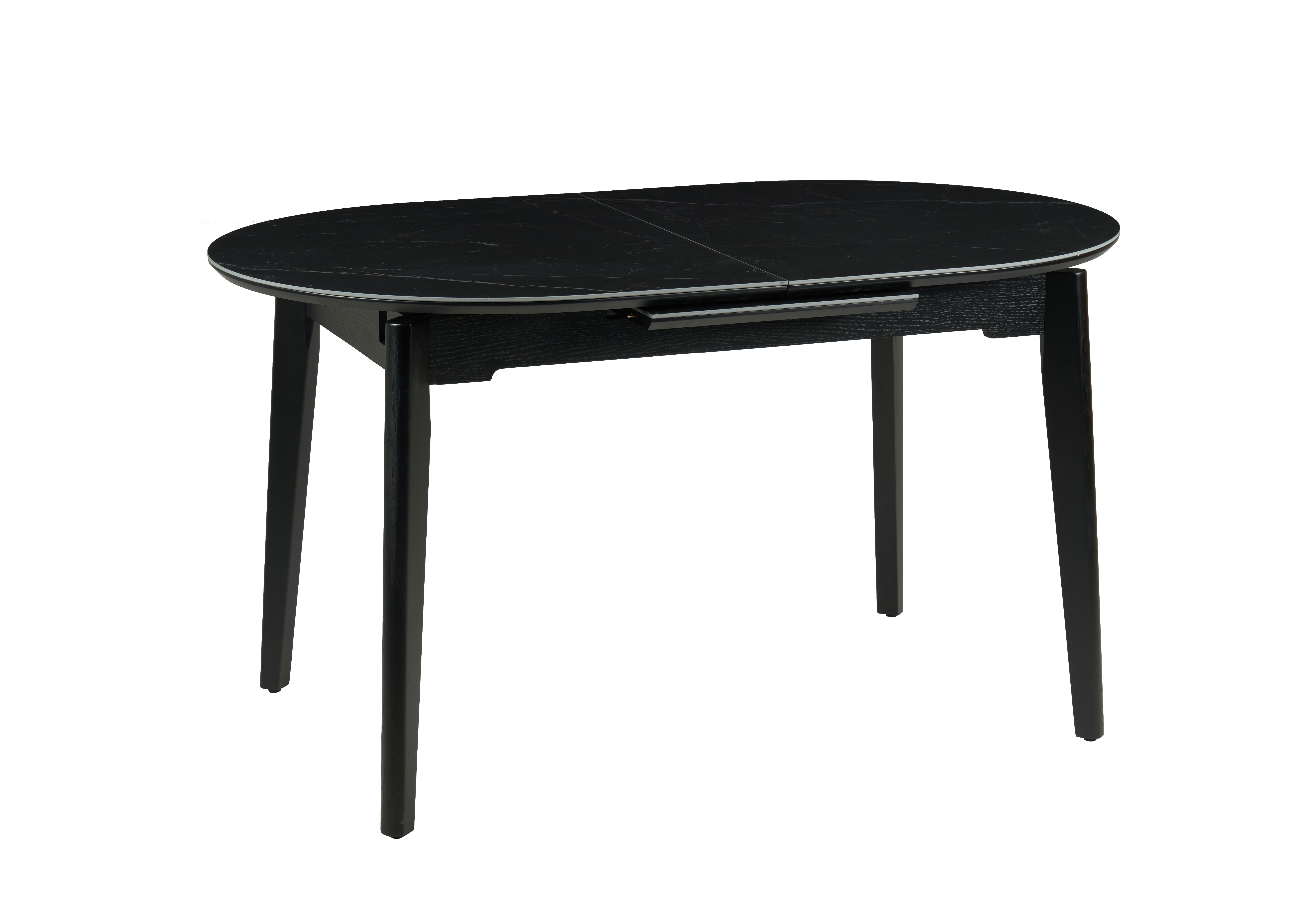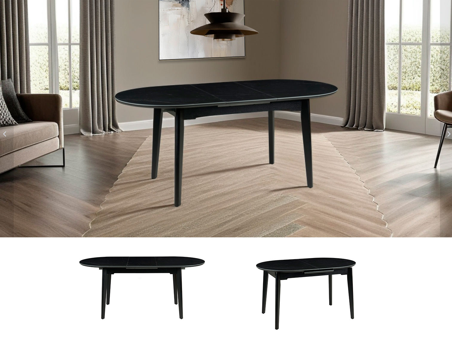 MESA EXTENSIBLE OVALADA 140/180*85*76 CM, TAPA PORCELANICO NEGRO Y BASE METAL NEGRO