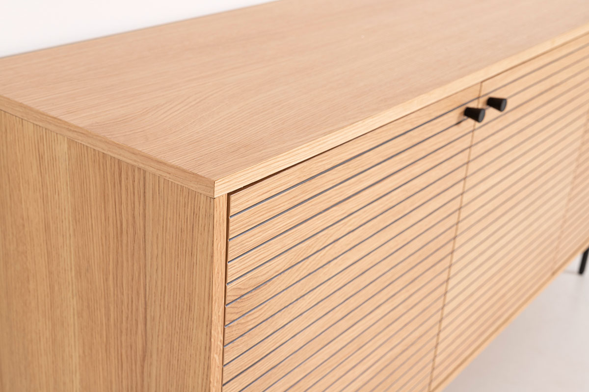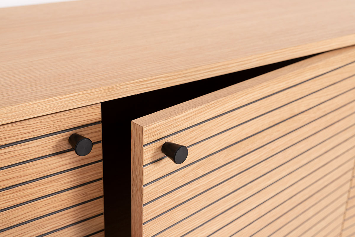 GDECO – APARADOR NELA. CHAPA DE ROBLE Y DM NEGRO. PATAS METAL NEGRO.