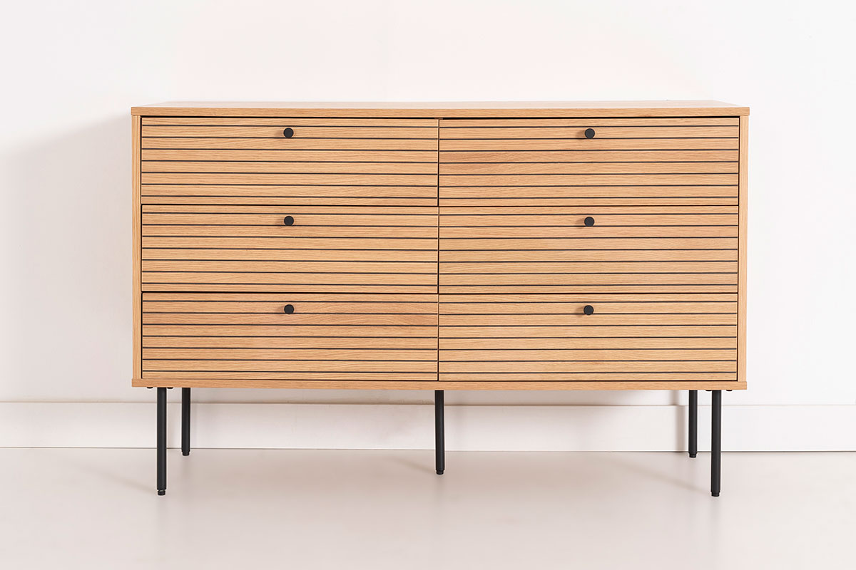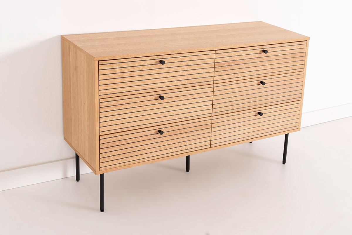 GDECO – CÓMODA NELA 6 CAJ. CHAPA DE ROBLE Y DM NEGRO. PATAS METAL NEGRO.