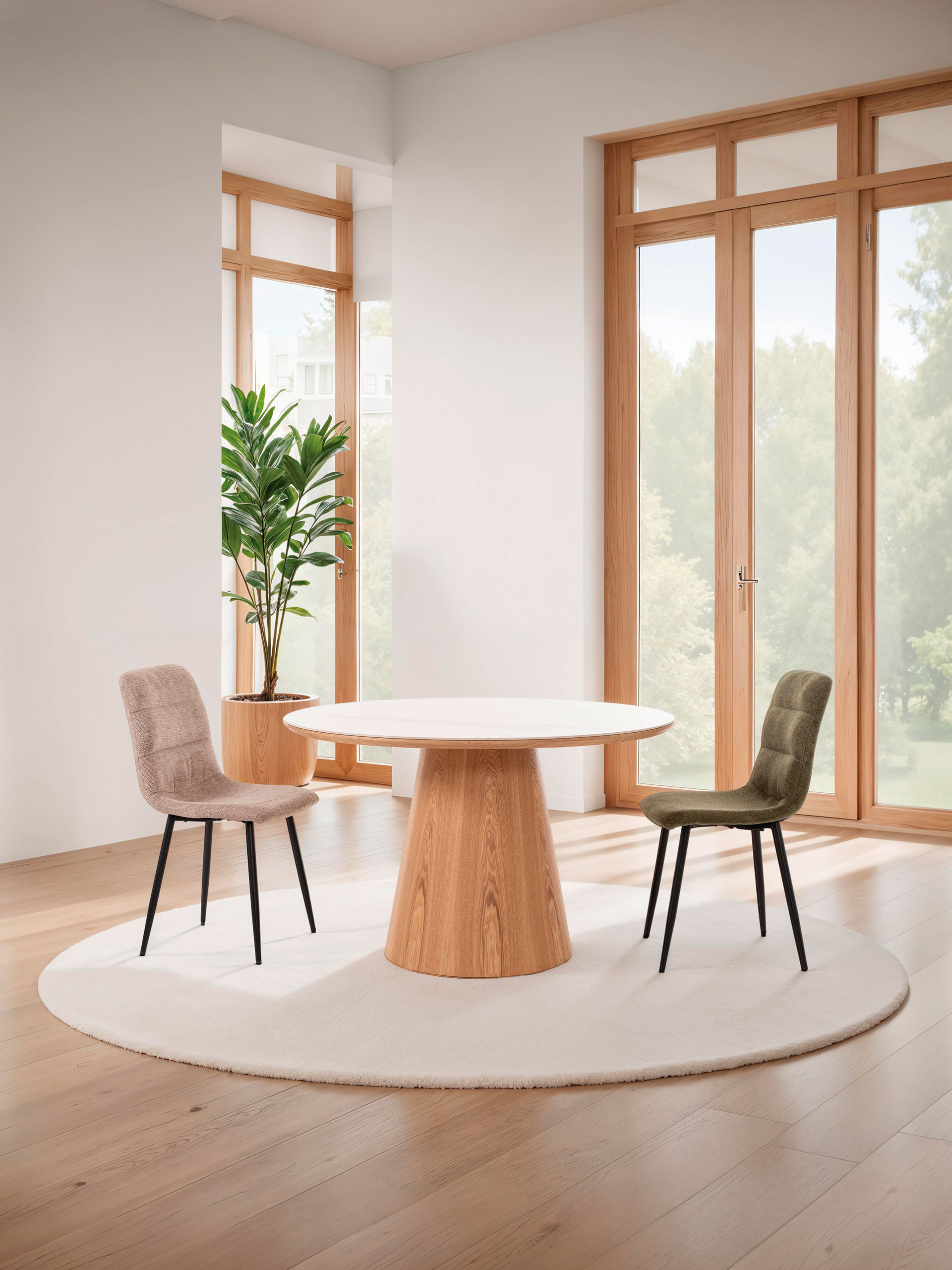 GDECO – MESA COMEDOR REDONDA 120 CM. TAPA PORCELANICO BLANCO, PIE CHAPA ROBLE. ALTURA 76 CM