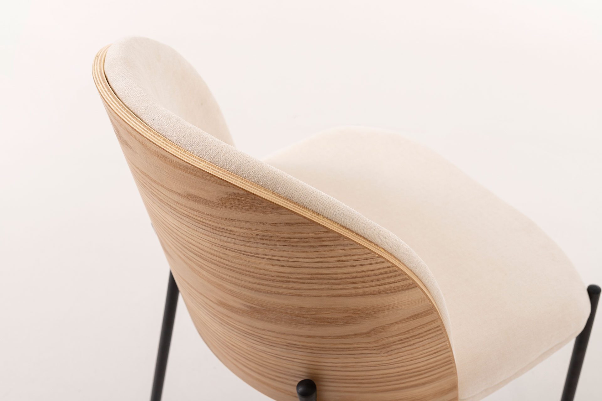 GDECO – SILLA INGRID 80*51*59 CM, ASIENTO CHAPA ROBLE CURVADO, TAPIZADO BEIGE Y PATAS METALICAS EN NEGRO, TEJIDO AQUACLEAN