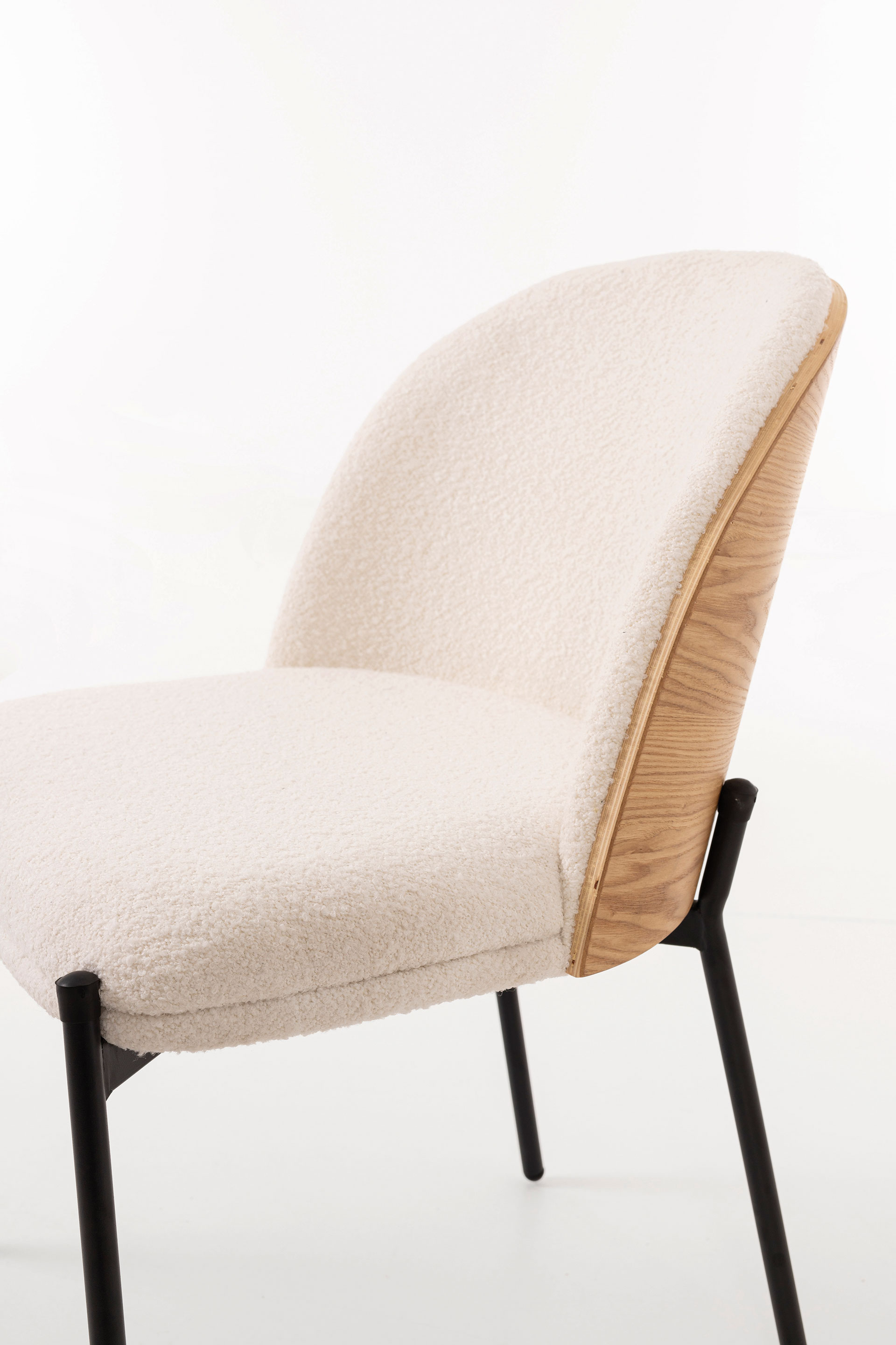GDECO – SILLA INGRID 80*51*59 CM, ASIENTO CHAPA ROBLE CURVADO, TAPIZADO BOUCLE BLANCO Y PATAS METALICAS EN NEGRO, TEJIDO AQUACLEAN