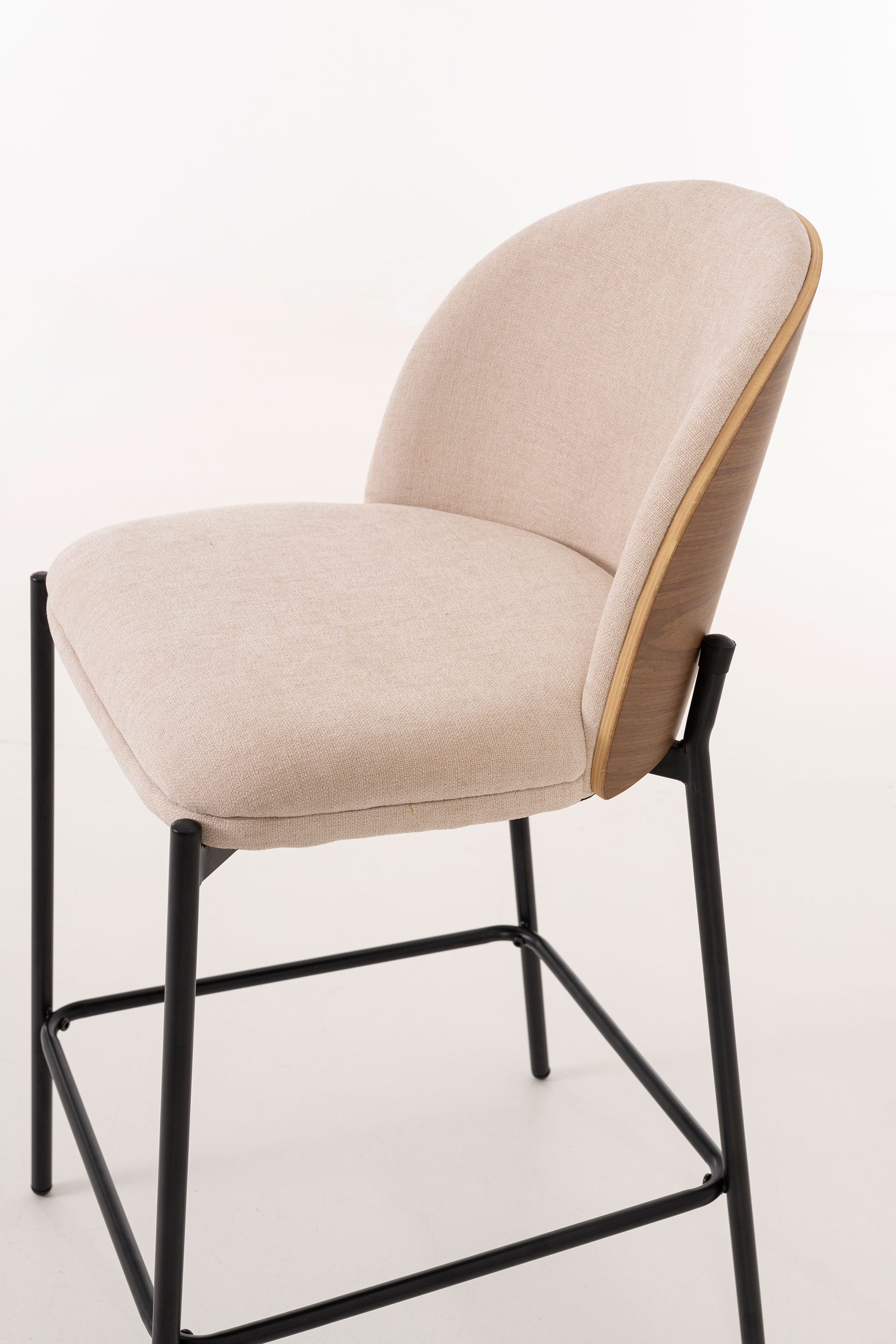 GDECO – TABURETE INGRID 90*51*59 CM, ASIENTO CHAPA NOGAL CURVADO, TAPIZADO BEIGE Y PATAS METALICAS EN NEGRO, TEJIDO AQUACLEAN