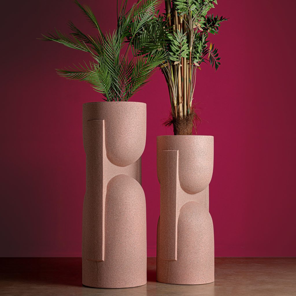 Macetero, fabricado en poliresina en color marrón.