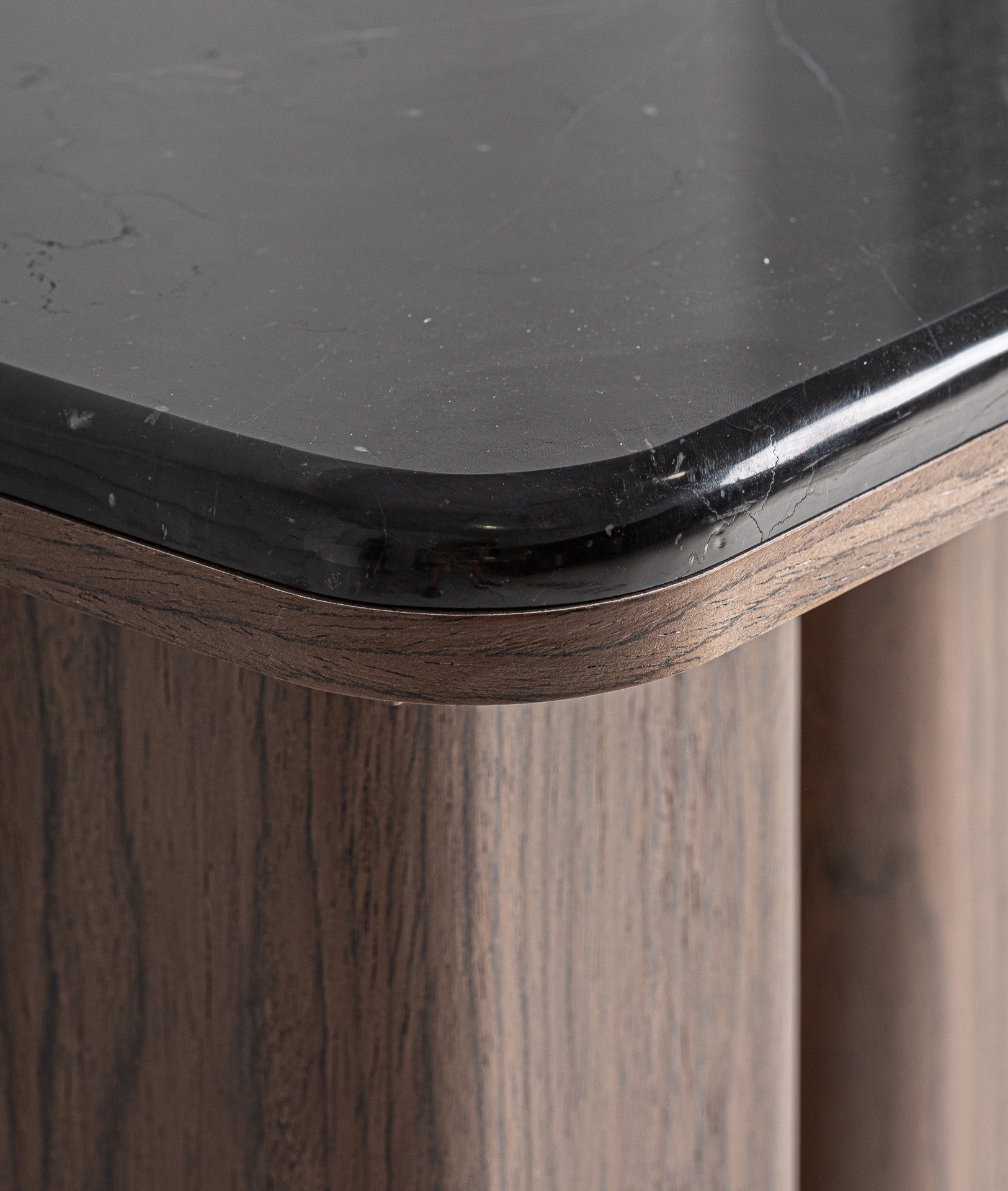 Mesa auxiliar Atlas de estilo contemporáneo, fabricado en madera dm en color marrón, combinado con mármol en color negro con acabado veteado y chapa de madera. Producto desmontable.