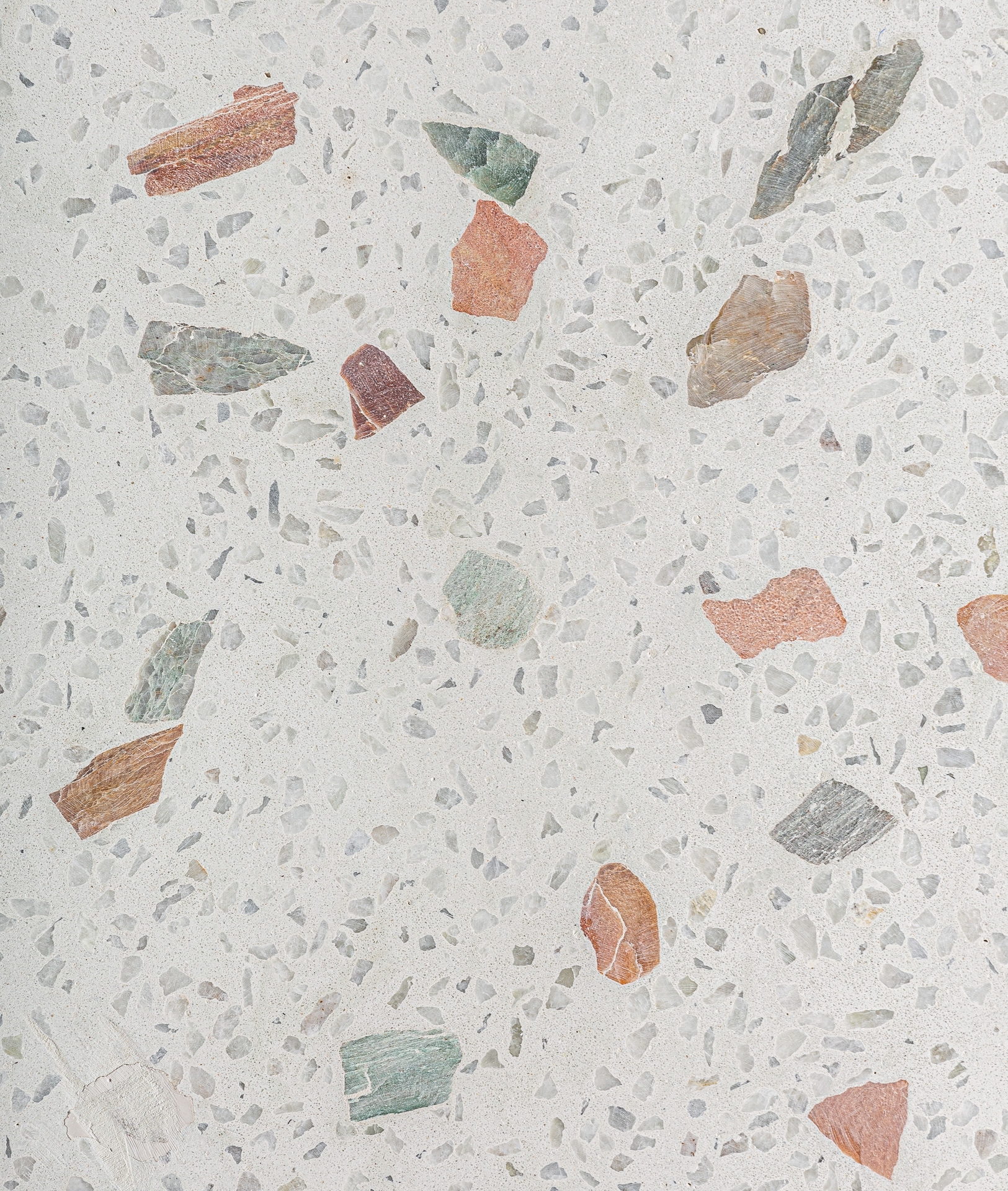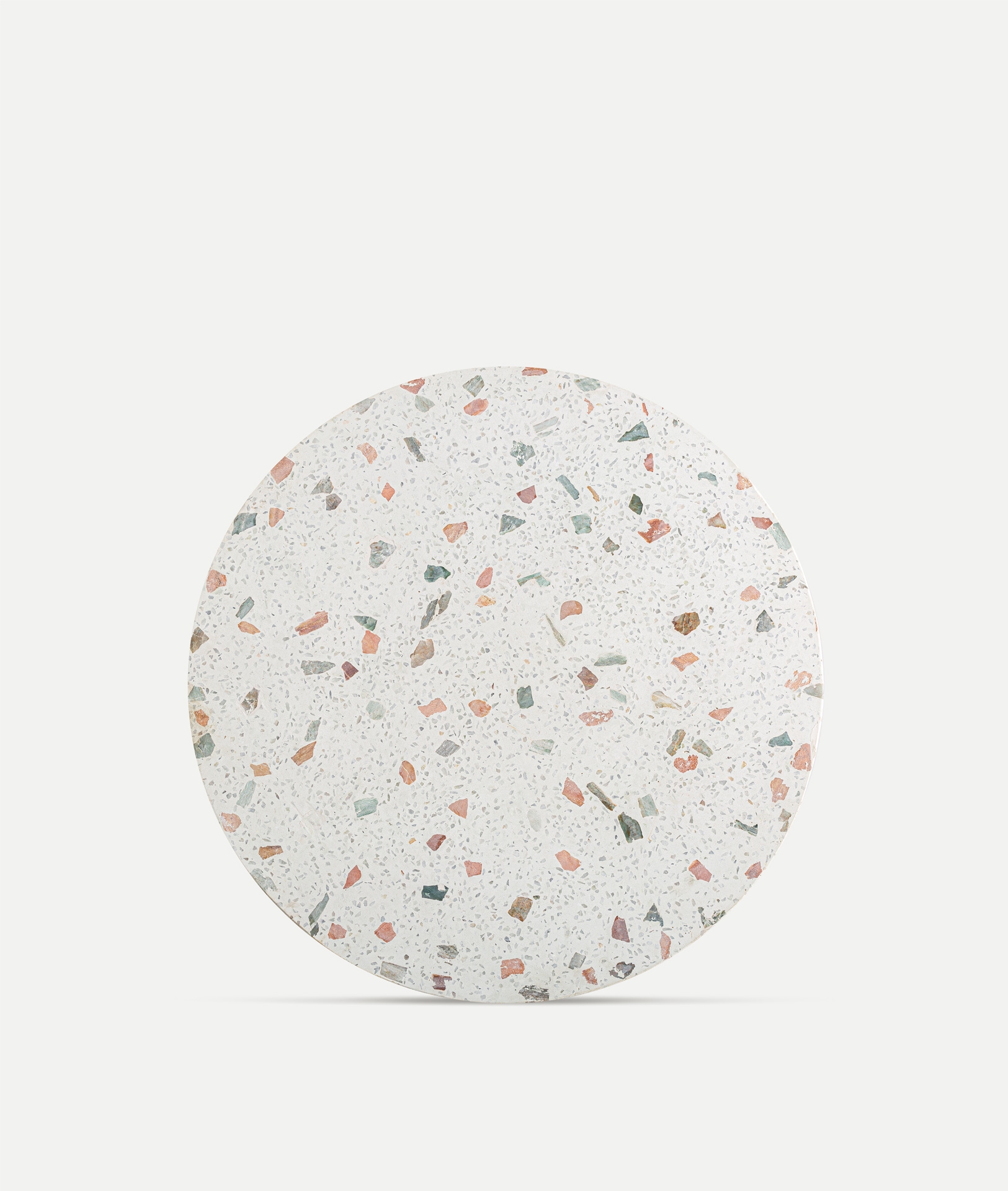 Mesa auxiliar Lautrec de estilo nórdico, fabricado en terrazo en color blanco, combinado con madera de mango en color marrón. Producto desmontable.