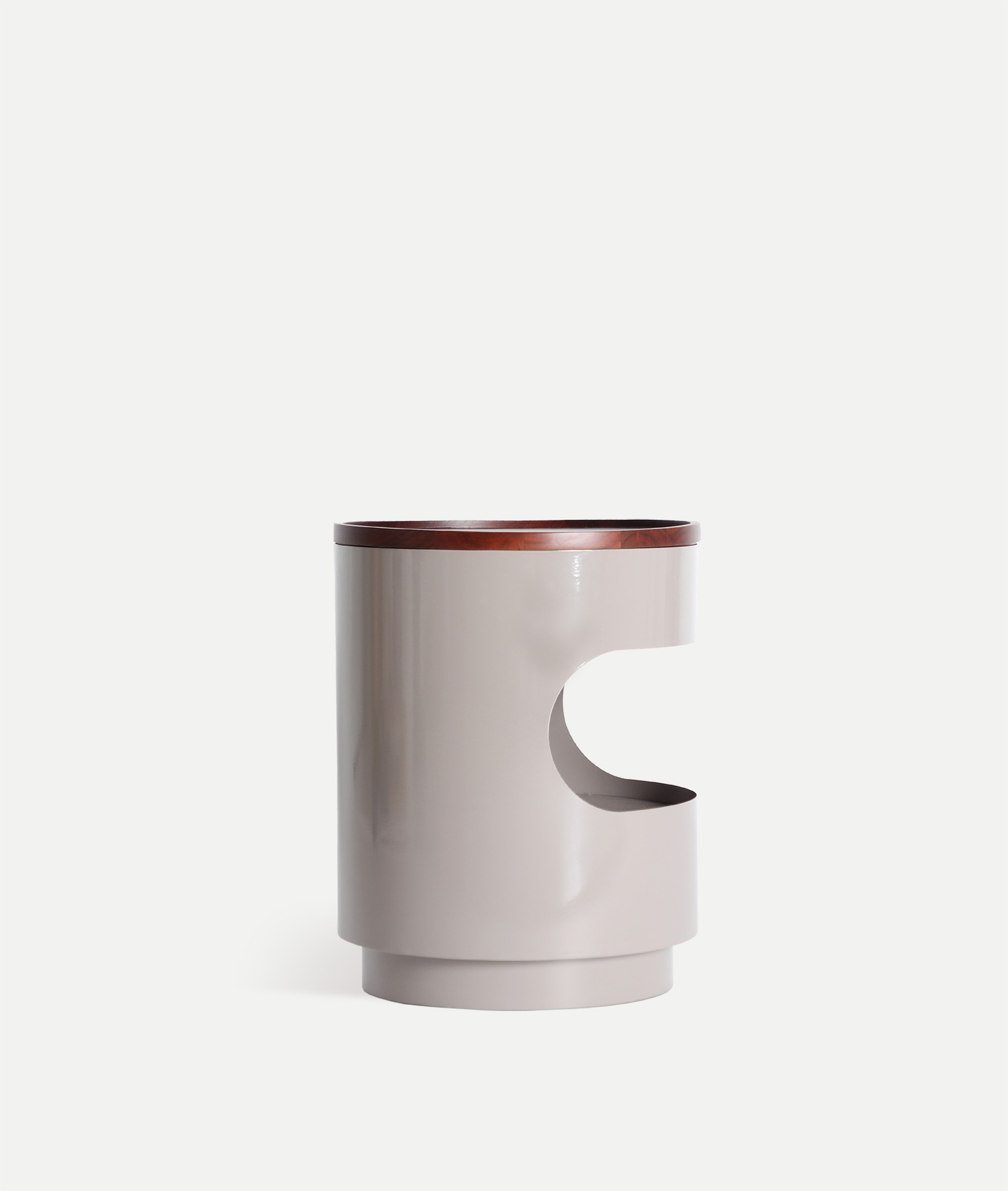 Mesita de noche Noa de estilo contemporáneo, fabricado en hierro en color gris con acabado brillo, combinado con madera de acacia en color marrón.