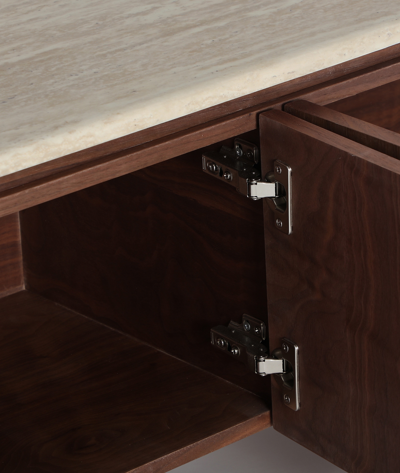 Mueble tv Dune de estilo contemporáneo, fabricado en mármol sintético en color beige, combinado con madera dm en color marrón y chapa de nogal. Producto desmontable.
