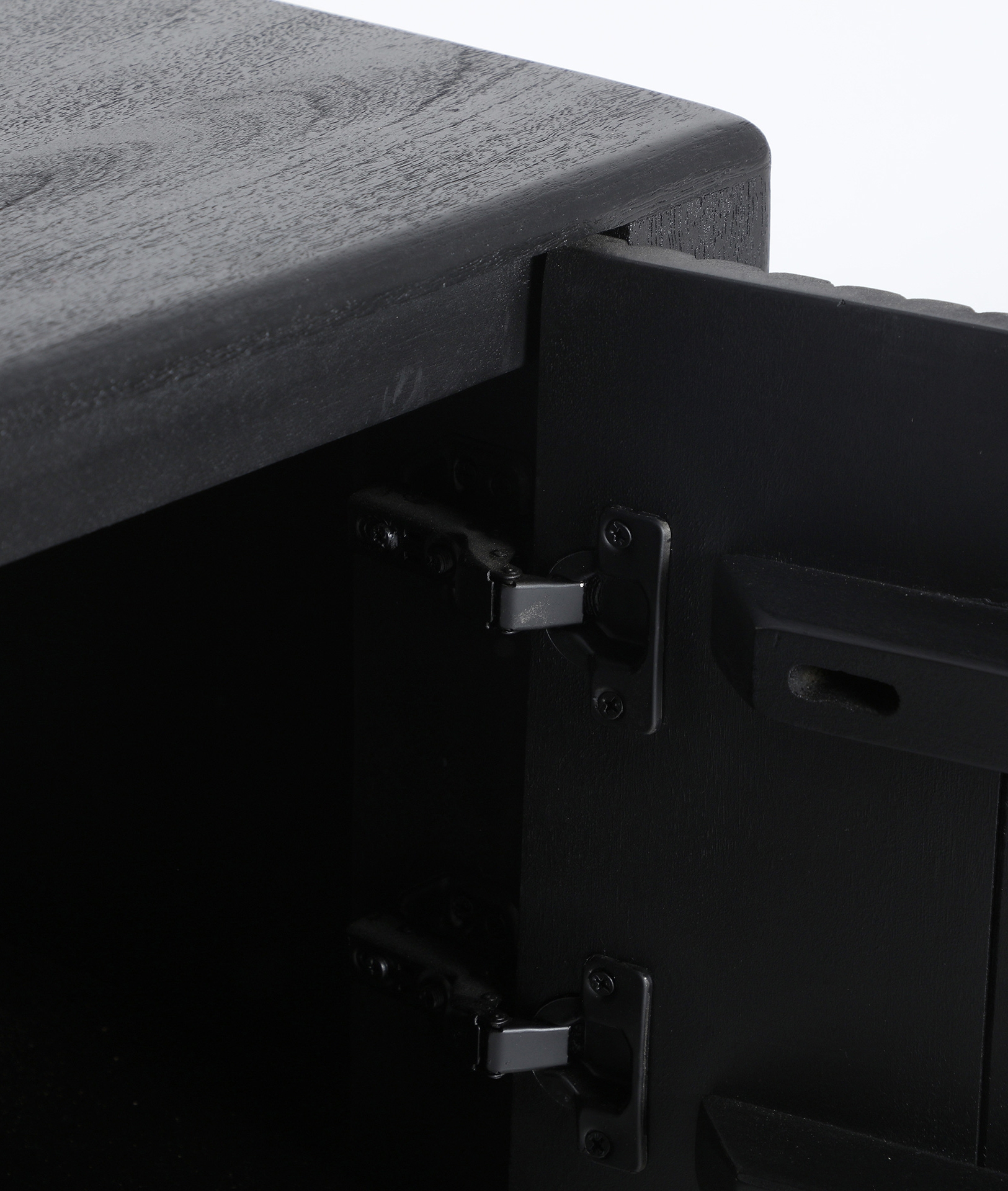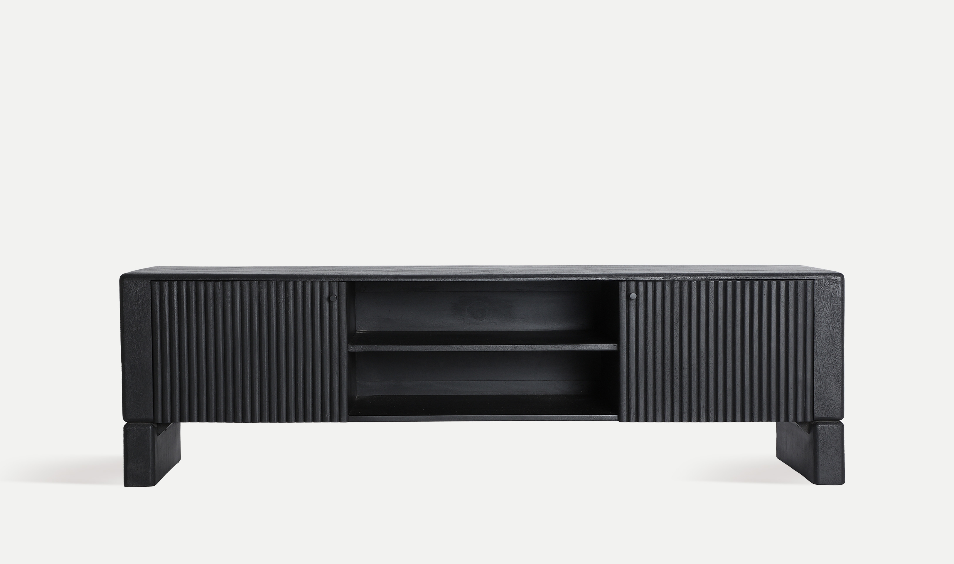 Mueble tv Nox de estilo contemporáneo, fabricado en madera de mango en color negro, combinado con madera dm.