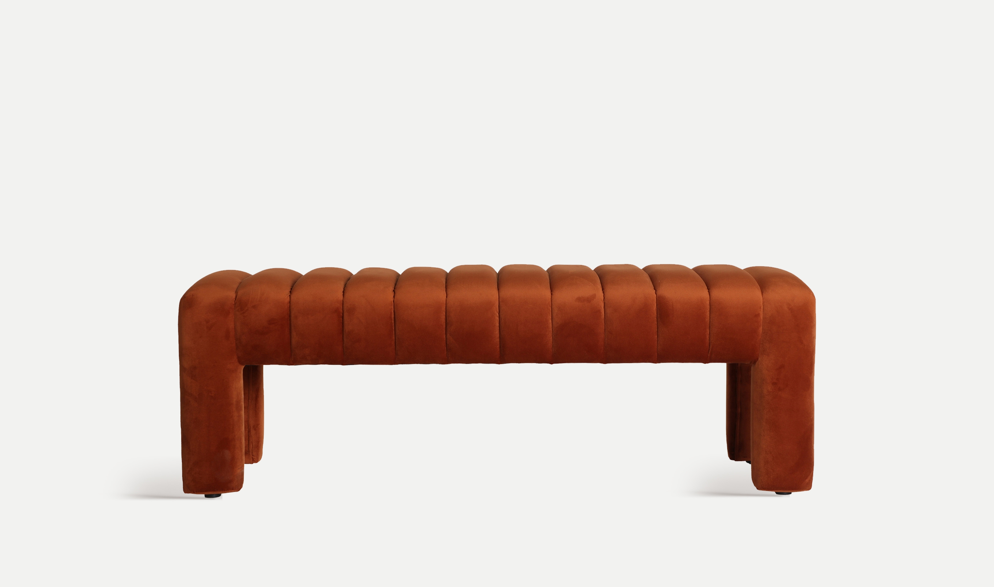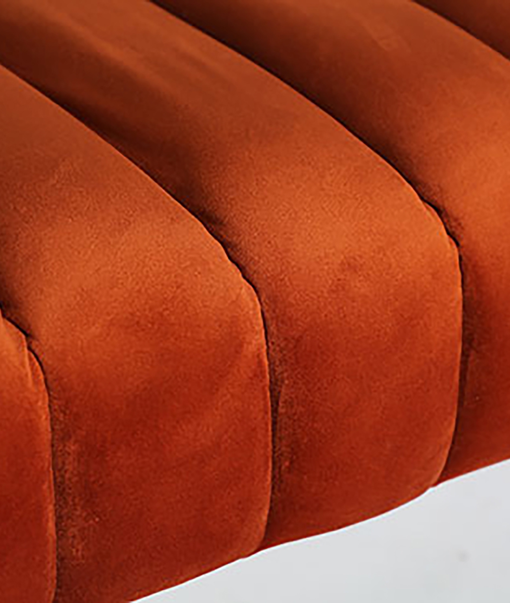 Pie de cama rectangular halle de estilo contemporáneo, fabricado en terciopelo en color ambar, combinado con madera contrachapada y espuma.