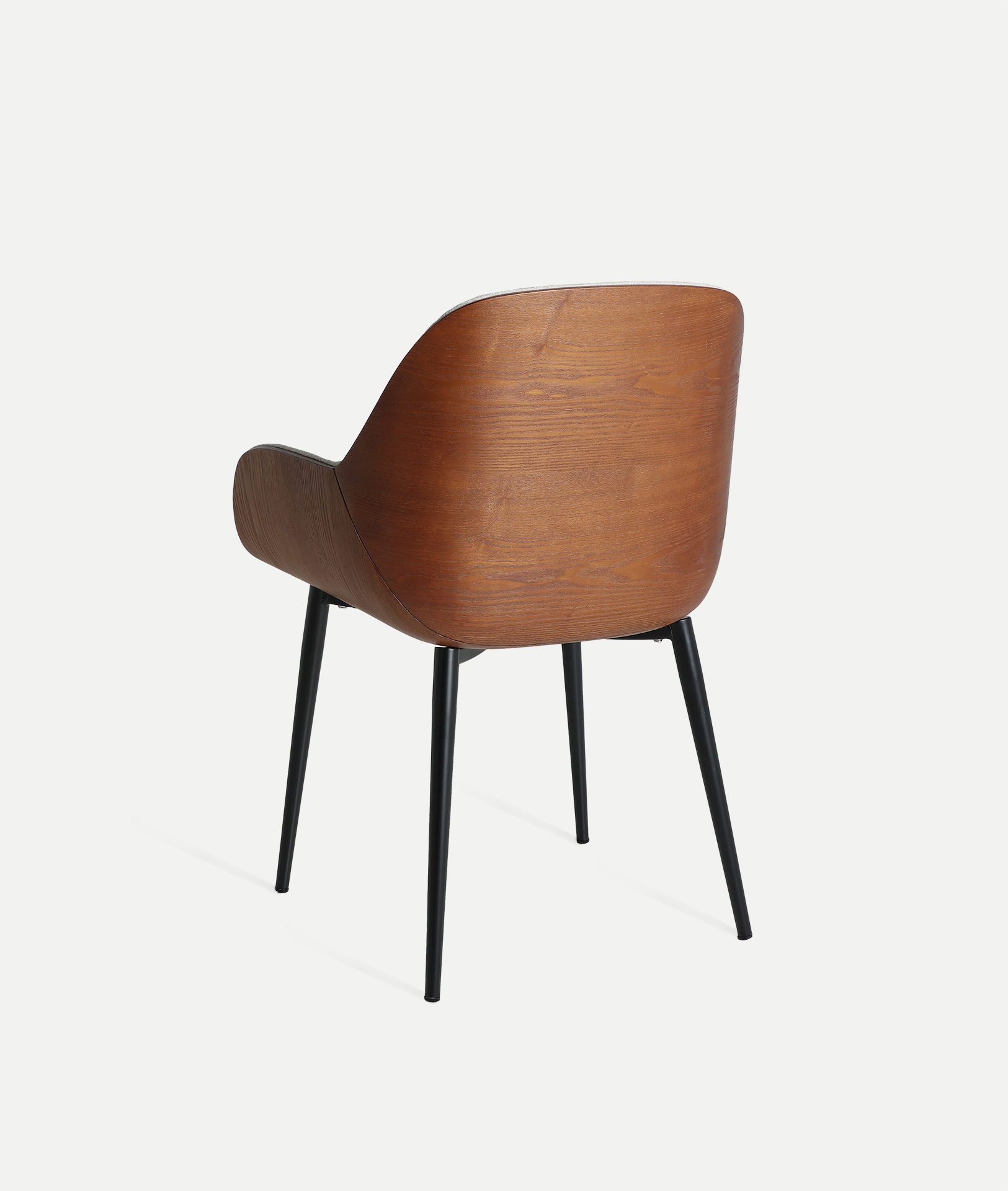Silla Beesd de estilo moderno, fabricado en madera contrachapada en color marrón, combinado con poliéster en color blanco roto y aluminio en color negro.