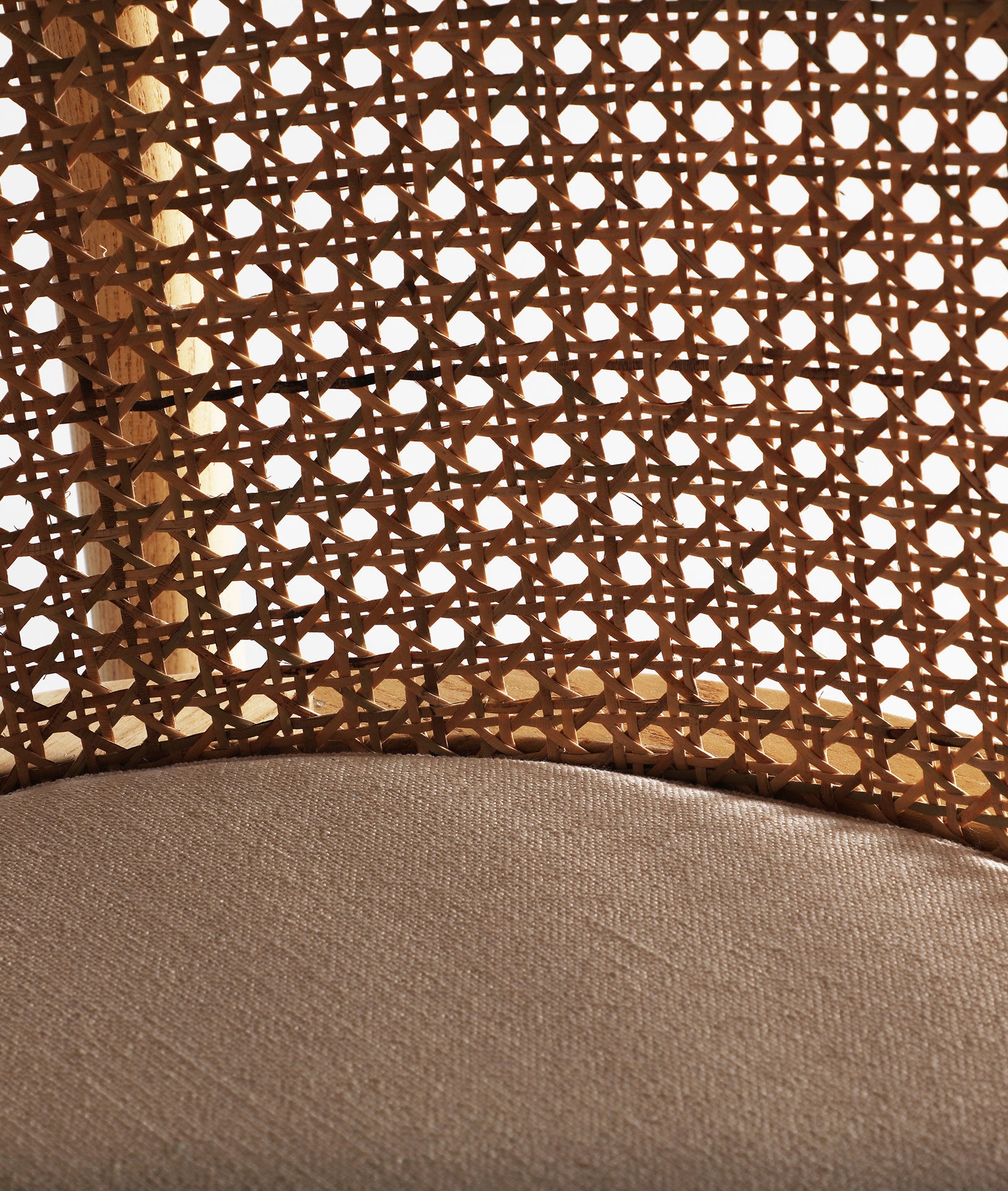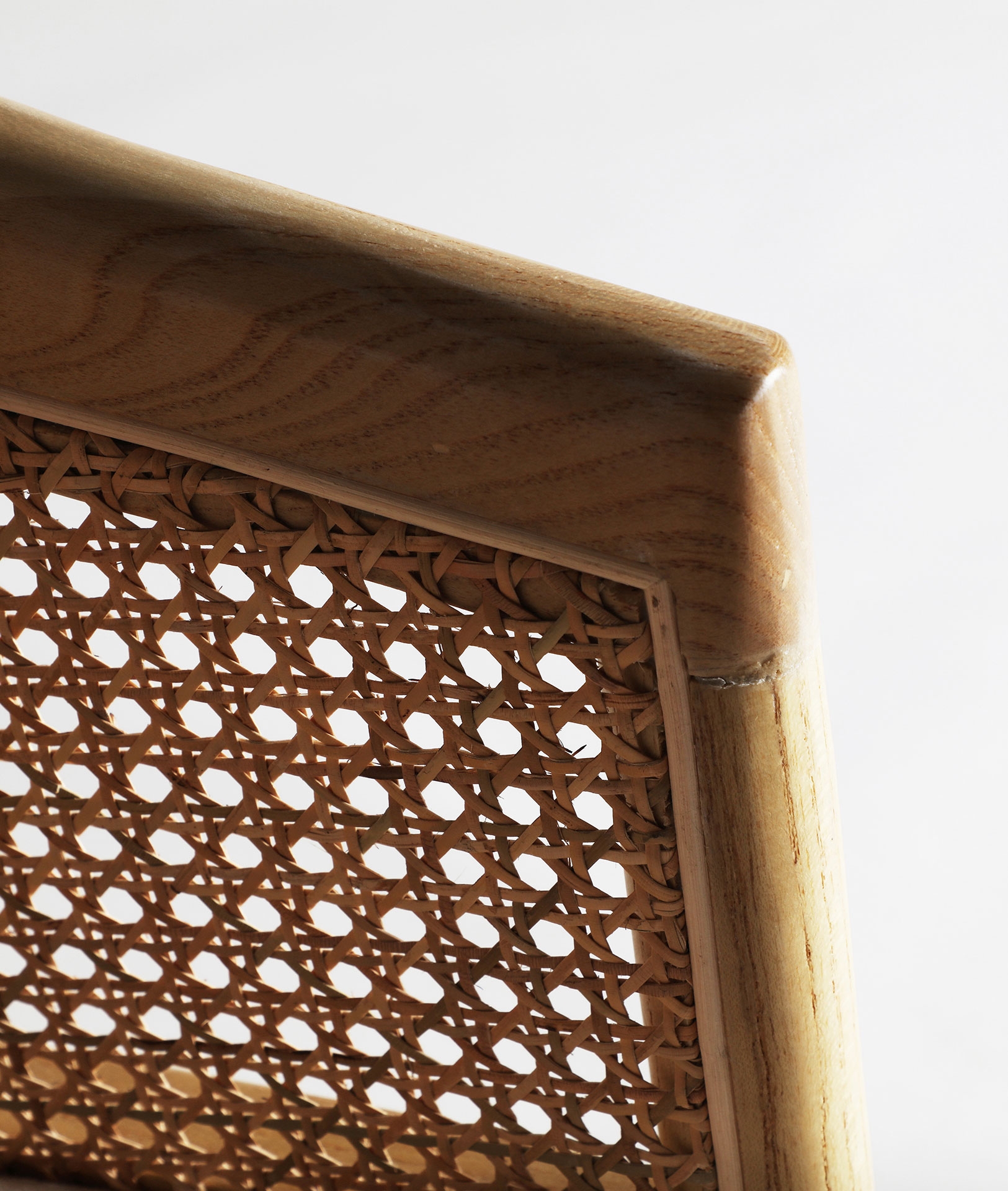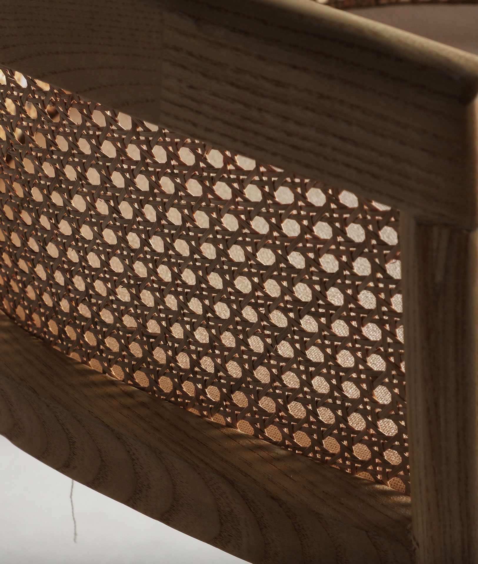 Silla rectangular vikan de estilo clásico, fabricado en madera de olmo en color marrón, combinado con ratán en color beige y lino.