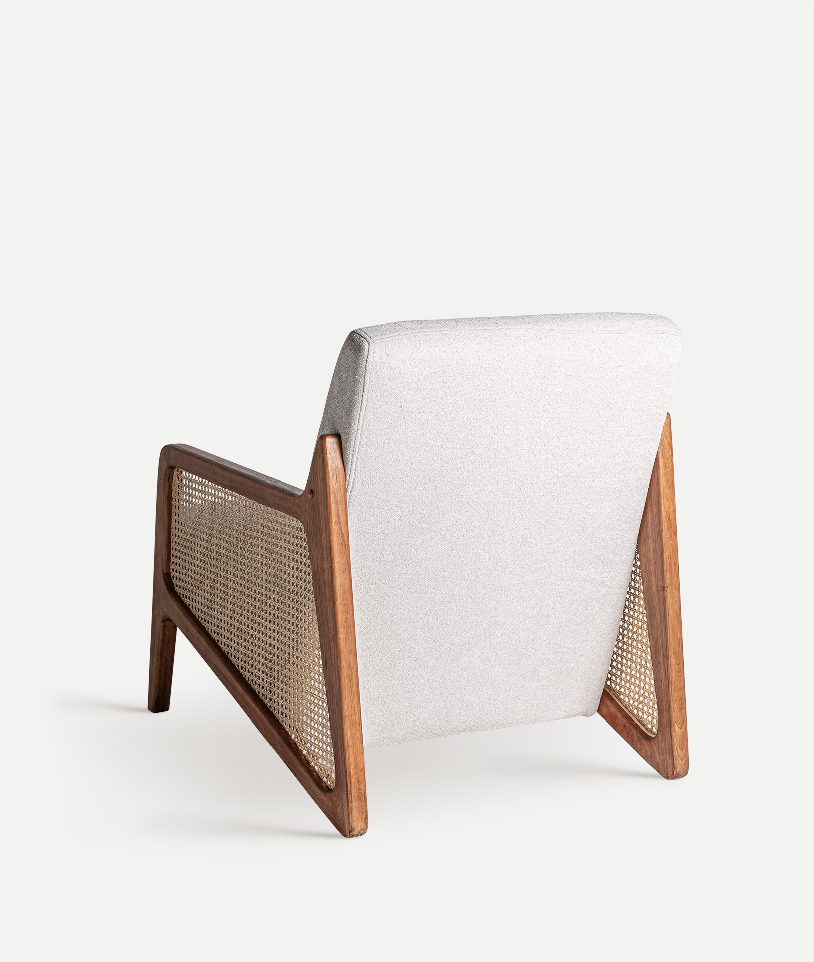 Sillón Gitsberg de estilo art deco, fabricado en ratán en color marrón, combinado con poliéster en color blanco roto y madera de caucho.
