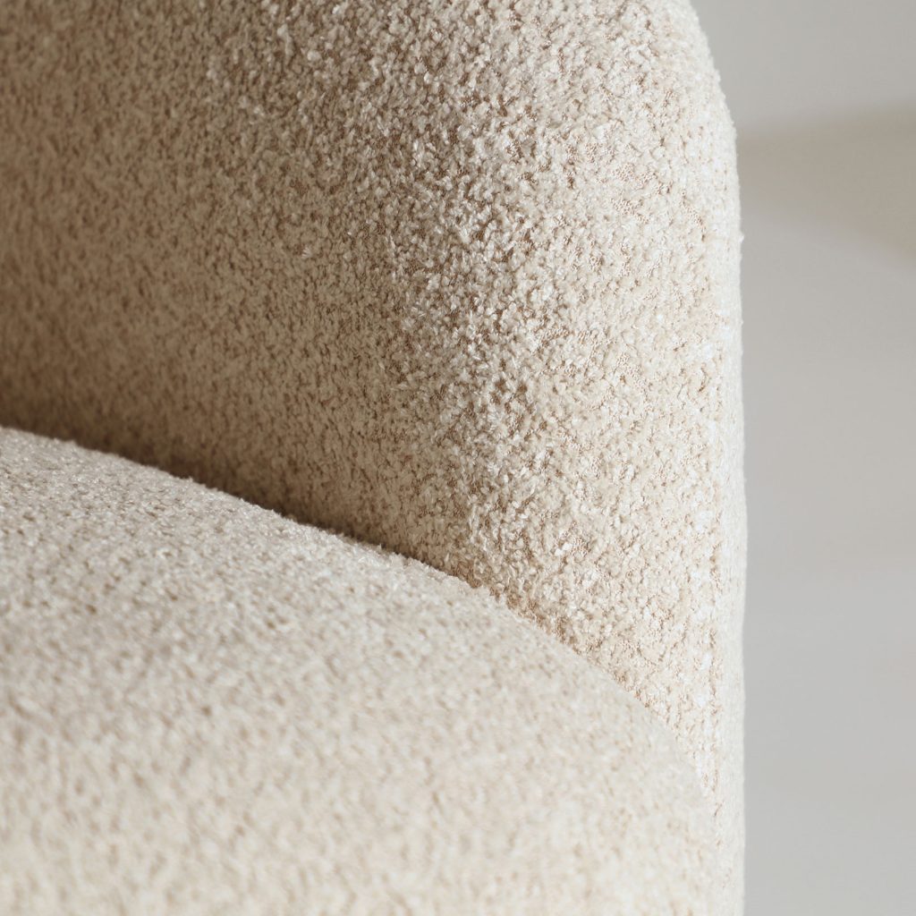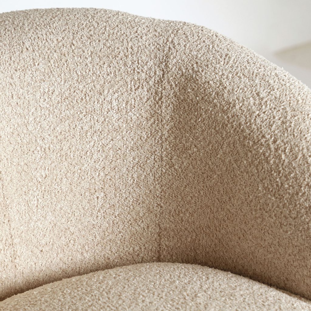 Sillón redondo bouclé privas de estilo art deco, fabricado en algodón bouclé en color crema, combinado con madera dm.