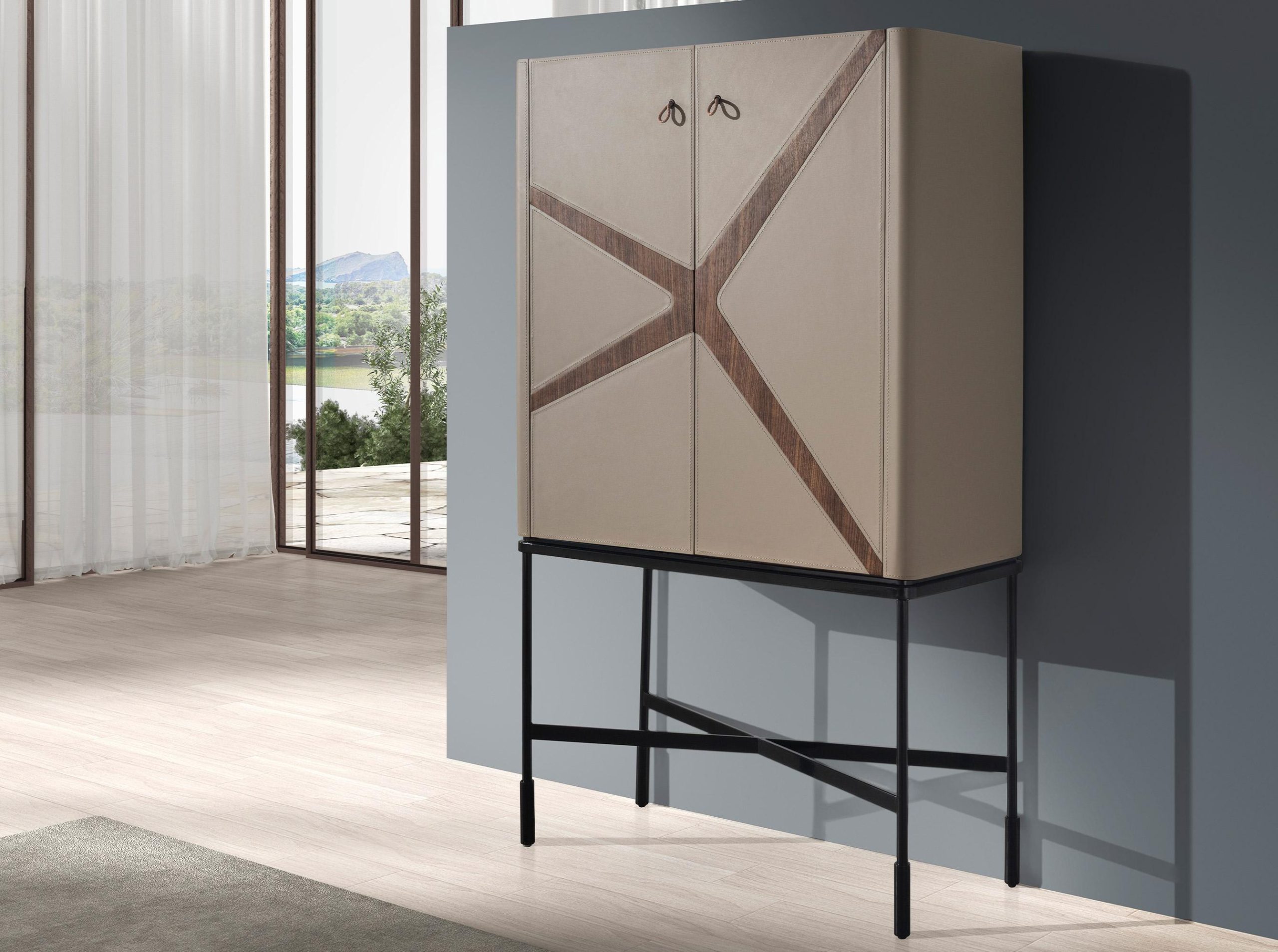 Aparador alto de diseño moderno con estructura de madera chapada en nogal natural tapizada en piel de origen vacuno color visón y unas originales patas de acero inoxidable color negro.