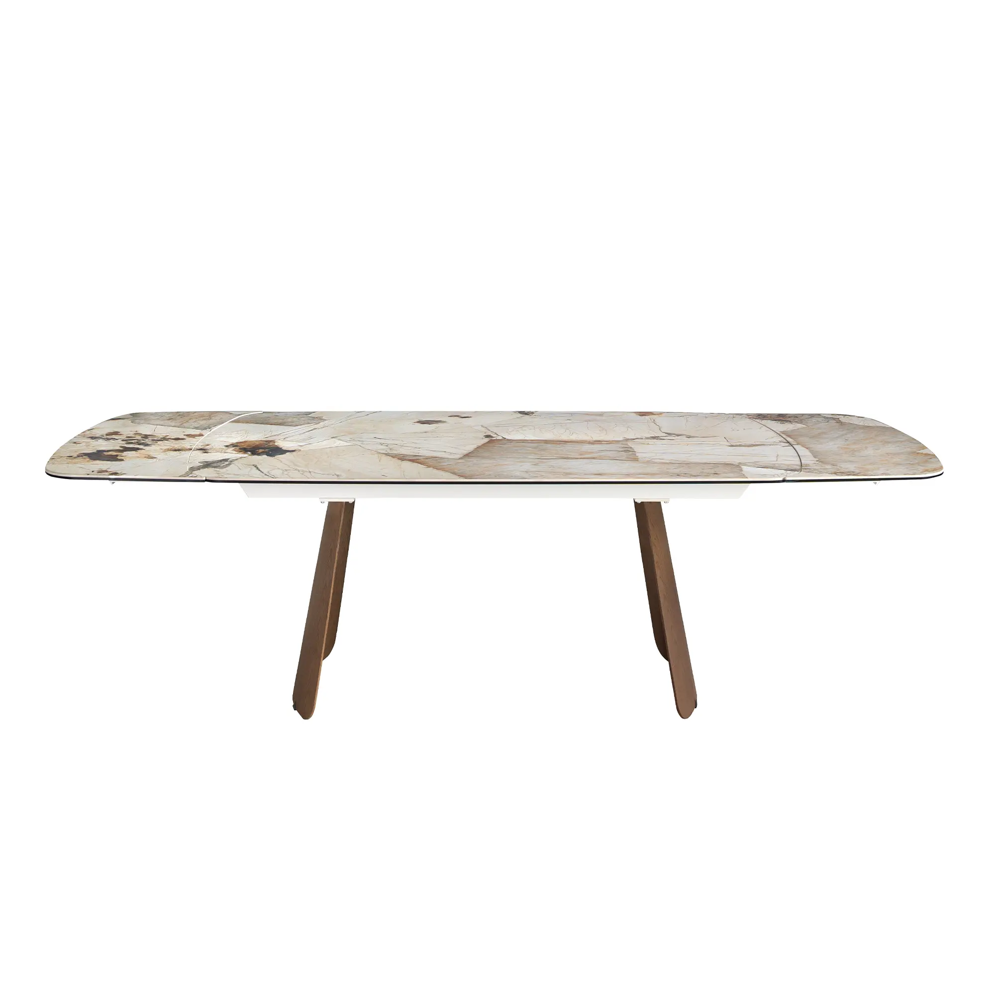 Mesa comedor extensible ovalada barril de diseño moderno con tapa de mármol porcelánico blanco con trazados en tonalidades óxido y matices gris oscuro en acabado brillo. Sus patas de madera chapada en nogal natural así como su adaptabilidad, la convierten en un mueble totalmente funcional y versátil para el día a día.