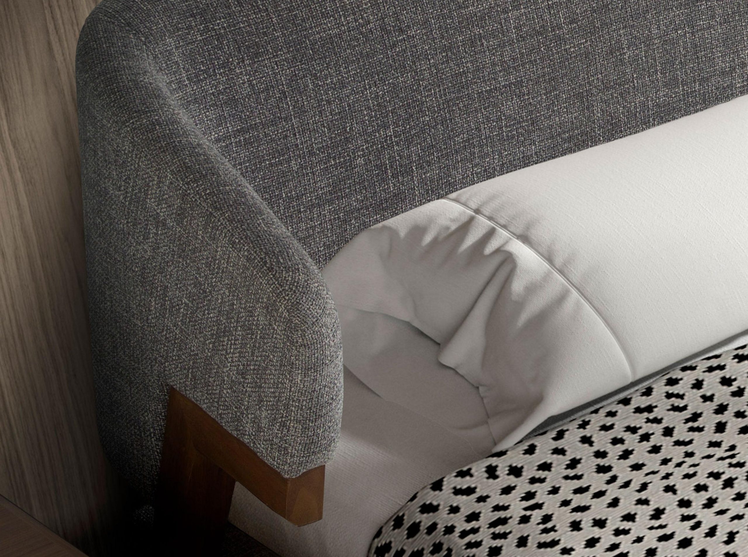 Cama de matrimonio de diseño moderno con un original cabecero y estructura fabricada en tela color gris, y patas de madera chapada en nogal natural. Una pieza clave para su dormitorio con la que aportará un estilo elegante y acogedor.