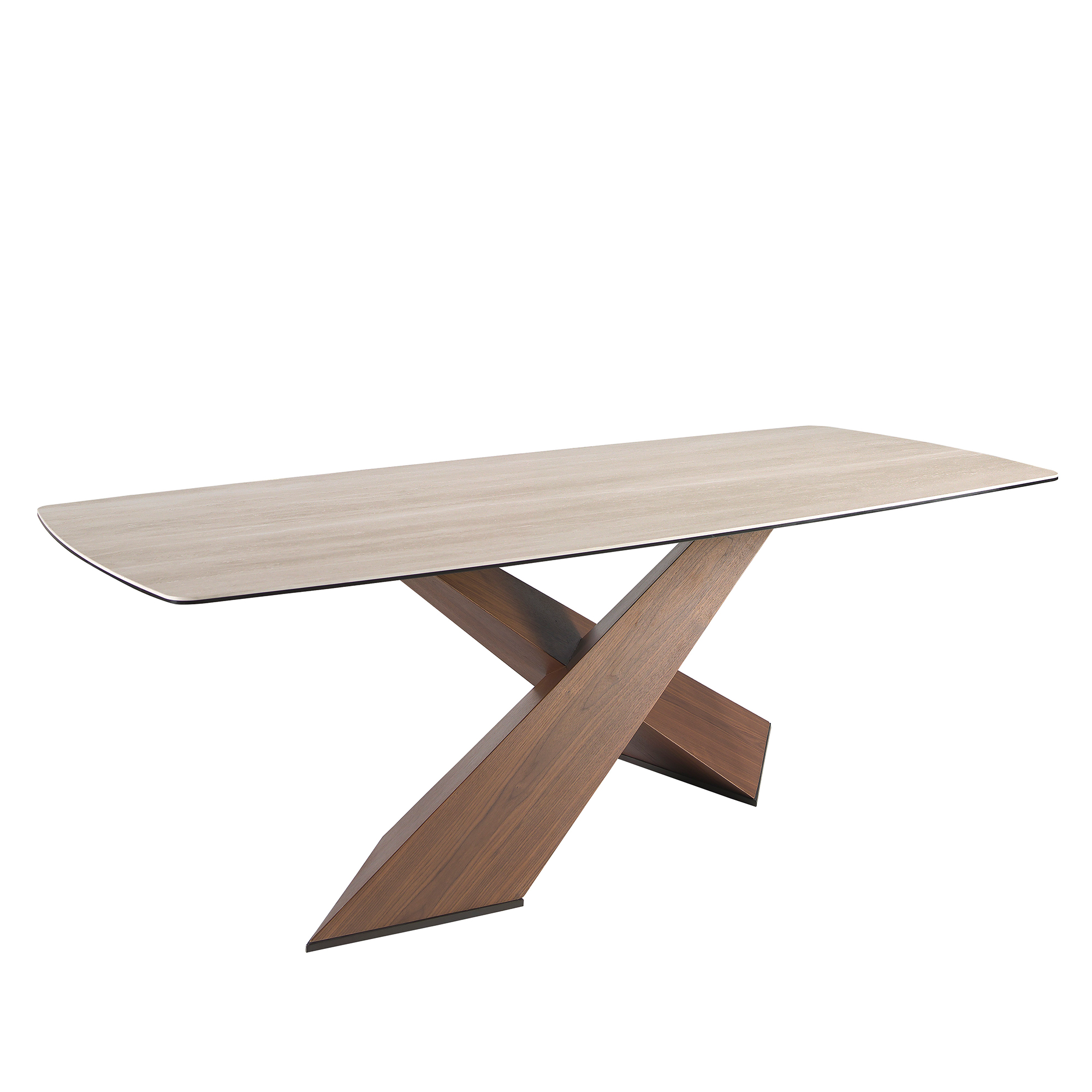 Estilo:  Mesa comedor de diseño Italiano. Mesa comedor ovalada barril de diseño moderno con tapa fija de mármol porcelánico color arena en acabado mate. Sus originales patas de madera chapada en nogal natural son elementos claves a destacar de su diseño.