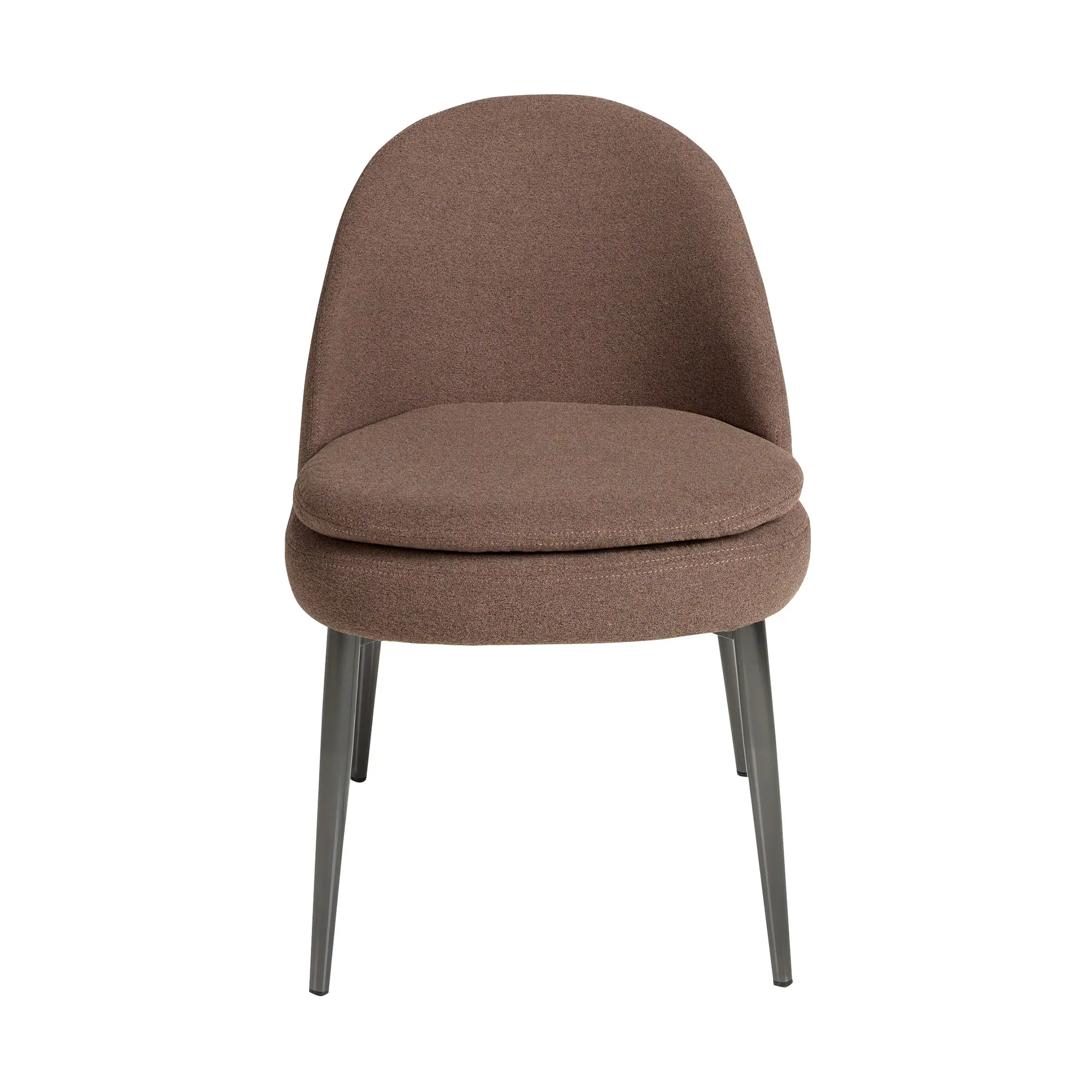 Silla de diseño moderno con asiento y respaldo tapizados en tela color marrón oscuro. Sus patas de acero inoxidable cromado oscuro de estilo vanguardista a la vez que atemporal, la convertirán en el must have de su cocina o comedor. Esta silla de la firma Angel Cerdá, aúna el estilo único y personal de la marca, así como la mayor comodidad y estabilidad, gracias a la alta calidad de su tapizado y la original estructura de patas.