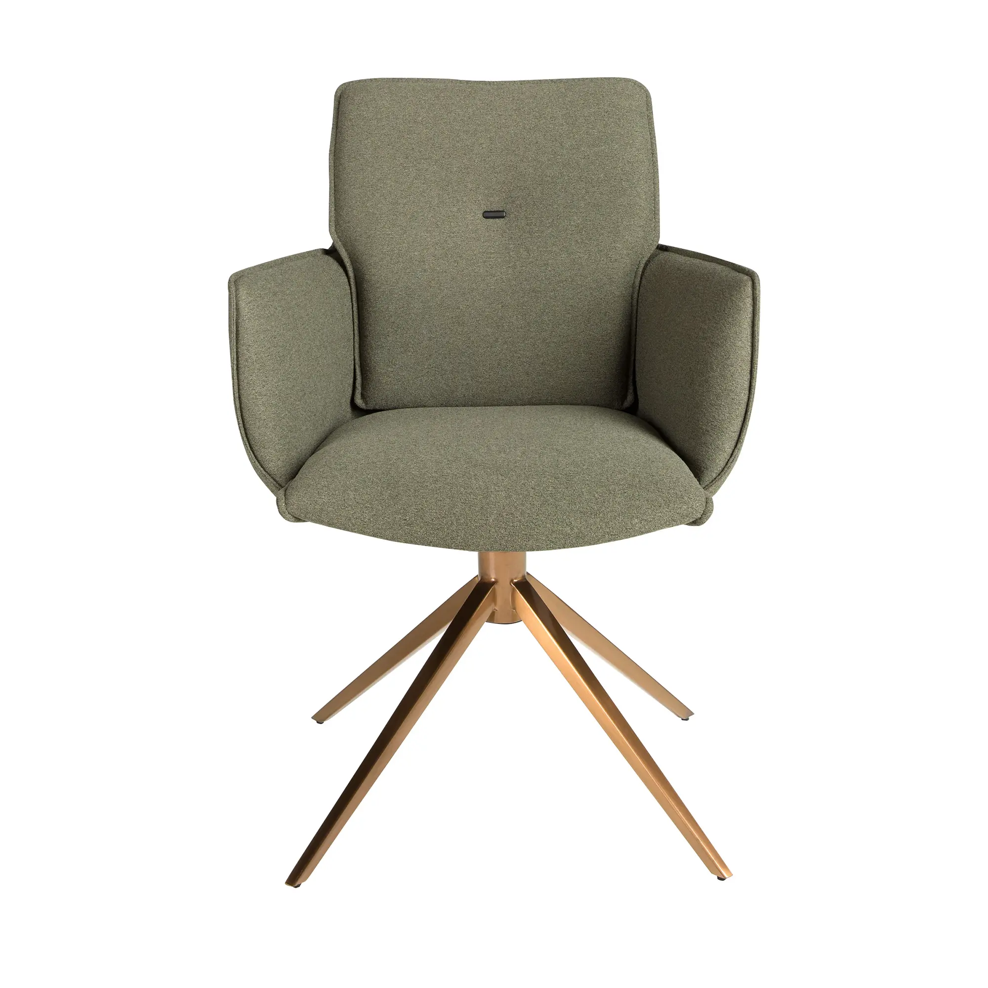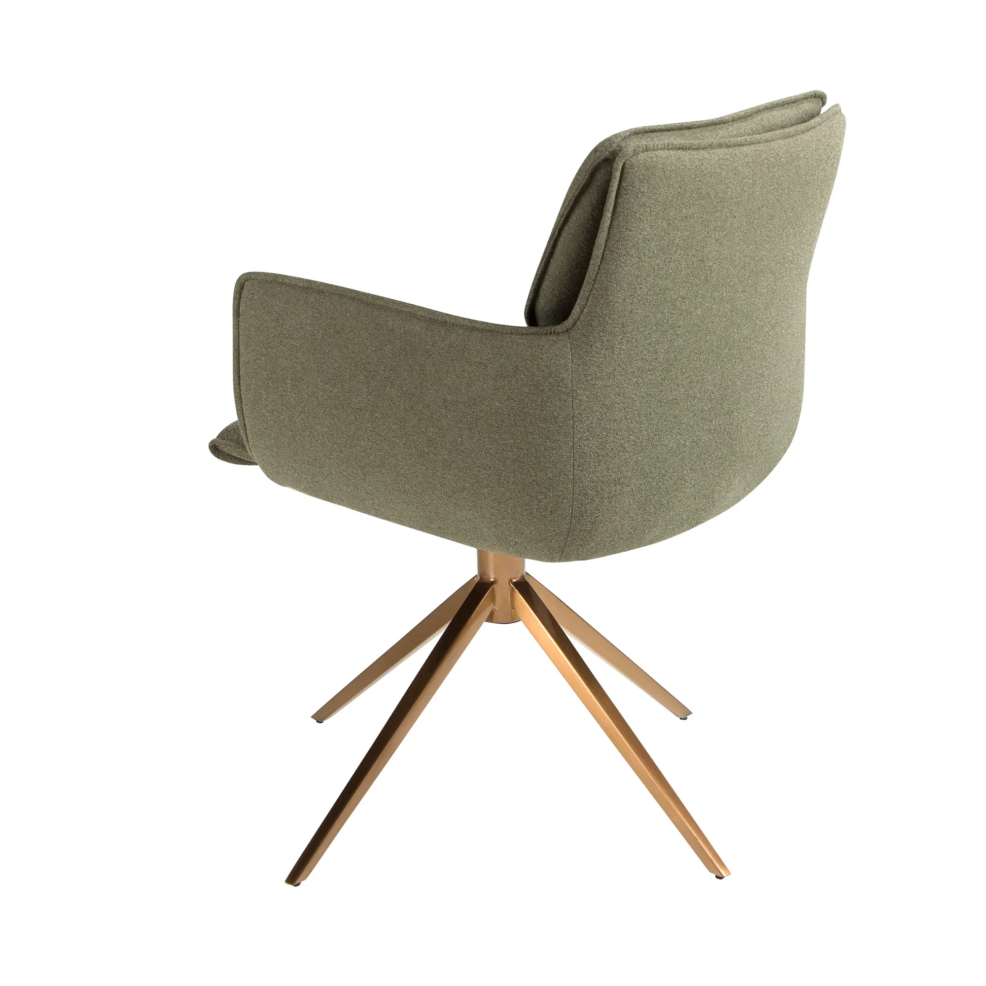 Silla giratoria con reposabrazos de diseño moderno con asiento y respaldo tapizados en tela color verde oliva. Sus patas de acero inoxidable pintado en color bronce de estilo vanguardista a la vez que atemporal, la convertirán en el must have de su cocina o comedor. Esta silla de la firma Angel Cerdá, aúna el estilo único y personal de la marca, así como la mayor comodidad y estabilidad, gracias a la alta calidad de su tapizado y la original estructura de patas.