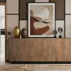 Este aparador está hecho de madera maciza de acacia, con un diseño moderno y natural. Cuenta con varios compartimentos: dos puertas abatibles con frente ondulado en el lado izquierdo y dos puertas de cristal en el lado derecho, una de ellas con estante interior. Al centro, un espacio abierto permite exhibir objetos decorativos. Su acabado resalta las vetas cálidas y características de la madera, combinando funcionalidad y estilo en una pieza versátil para salón, comedor o despacho.