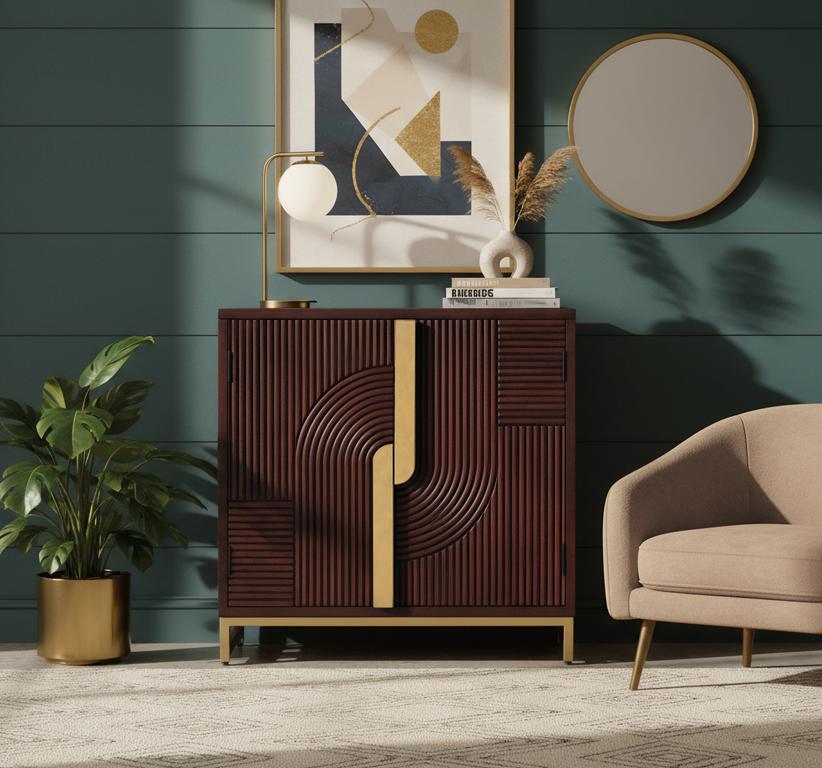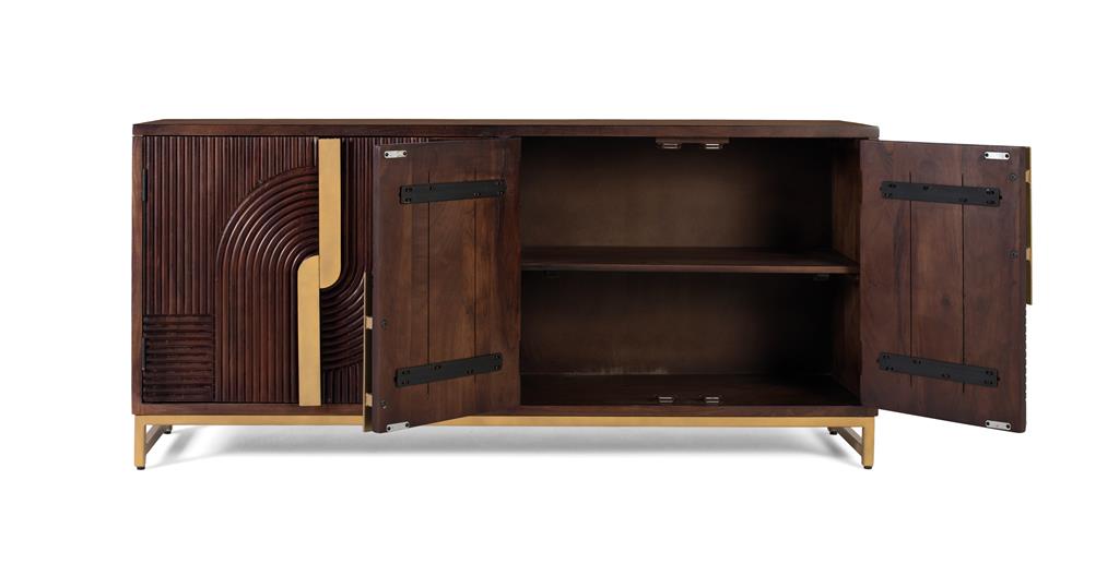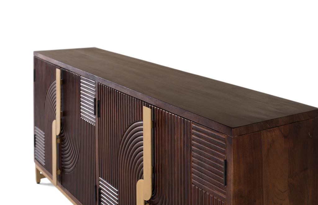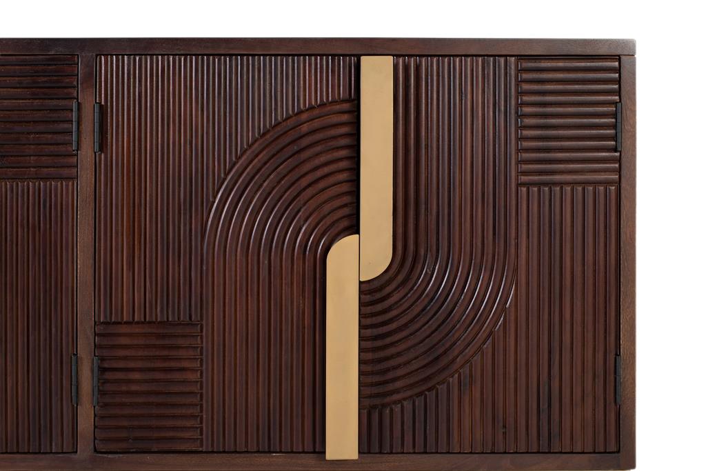 Aparador de madera de mango maciza, acabado en un tono oscuro que resalta la veta natural de la madera. La pieza cuenta con cuatro puertas frontales, tras las cuales se esconden baldas interiores amplias. El diseño destaca por sus relieves decorativos curvos tallados en las puertas, combinados con los tiradores en metal dorado, que aportan un estilo moderno con un toque art déco. La base metálica elevada refuerza la estructura y proporciona ligereza visual.