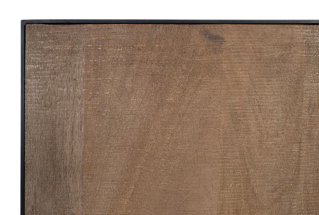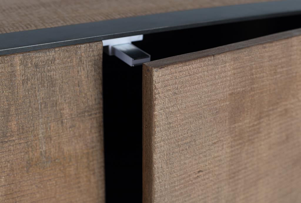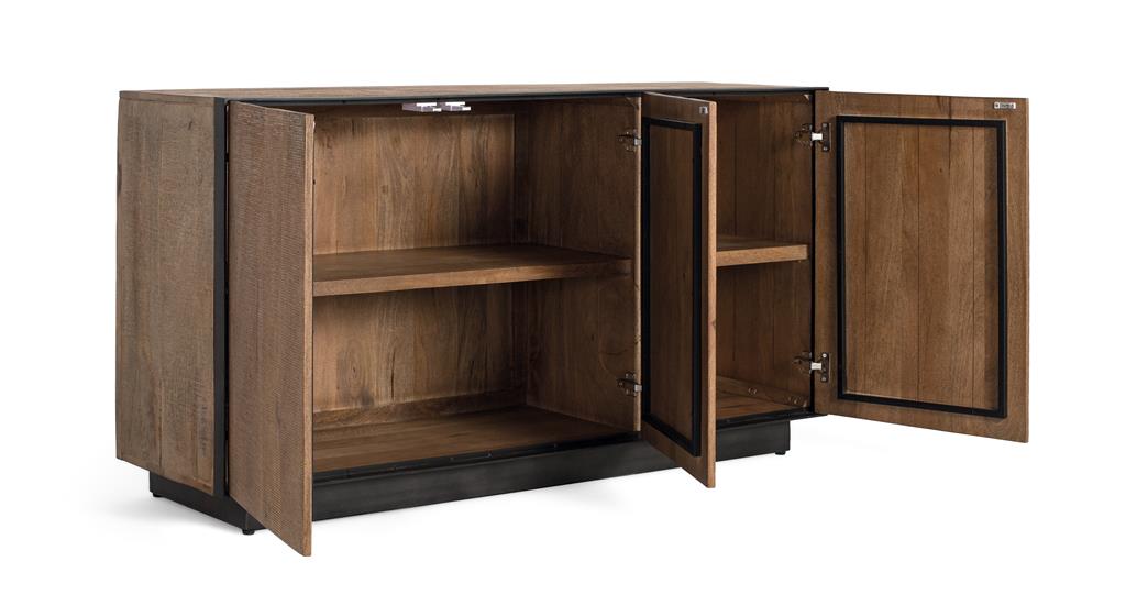 Aparador de 3 puertas fabricado en madera de mango con acabado natural que resalta la belleza de sus vetas. Su diseño minimalista incorpora un sistema de apertura push, lo que permite prescindir de tiradores y mantener una estética limpia y moderna. En su interior dispone de baldas que ofrecen un práctico espacio de almacenaje. La estructura está enmarcada por un perfil de metal en color negro que recorre la parte frontal y se complementa con el zócalo del mismo acabado, aportando un contraste elegante y un aire industrial al conjunto.