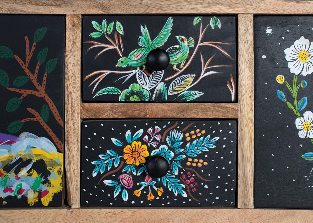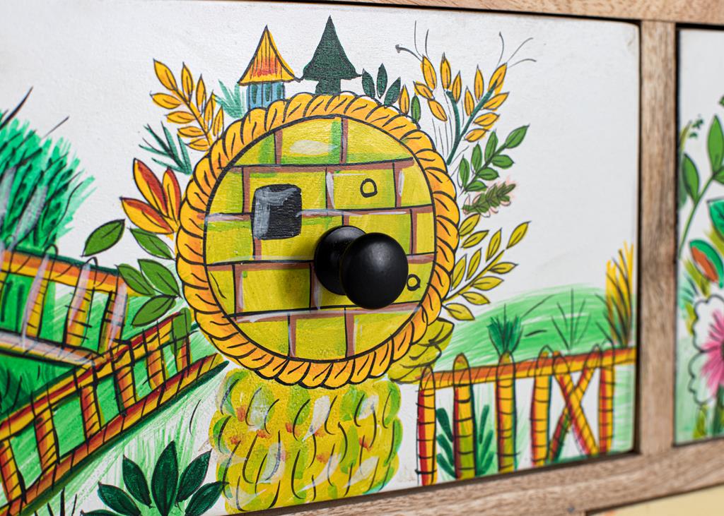 Cómoda fabricada en madera de mango con un marcado estilo étnico y artesanal. Presenta cajones de distintos tamaños, cada uno pintado a mano con escenas llenas de color y detalle. Entre sus decoraciones destacan animales, paisajes naturales, flores, casas tradicionales y figuras fantásticas, creando un conjunto alegre y narrativo. Además de su utilidad como mueble de almacenaje, es una pieza decorativa única que llena el espacio de encanto bohemio y un aire exótico.