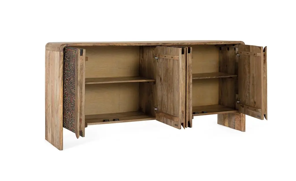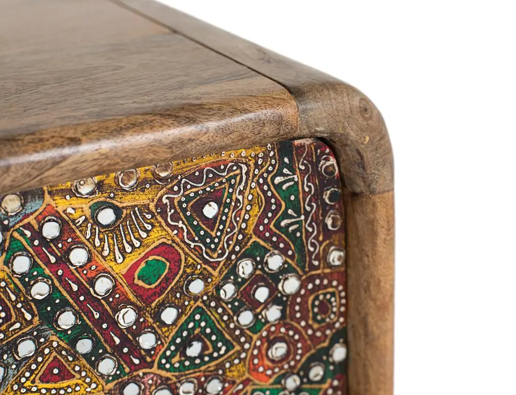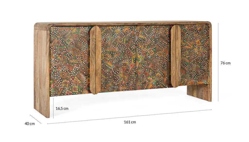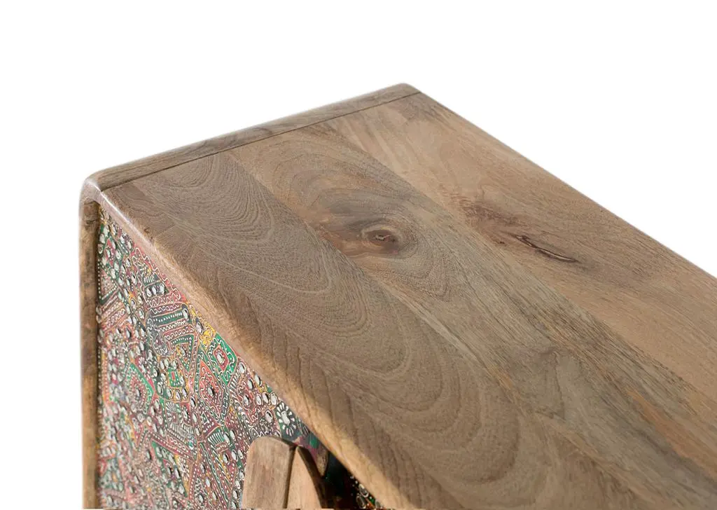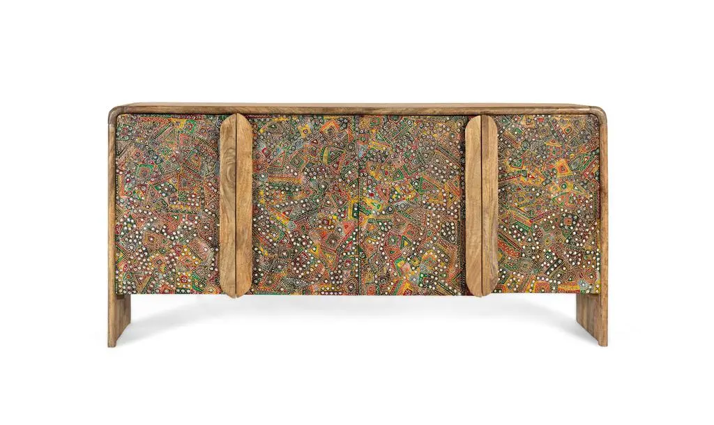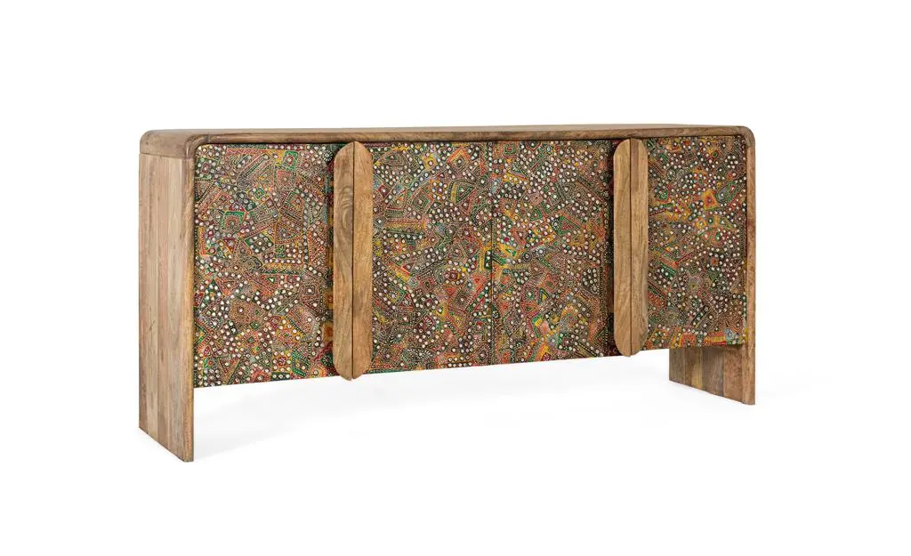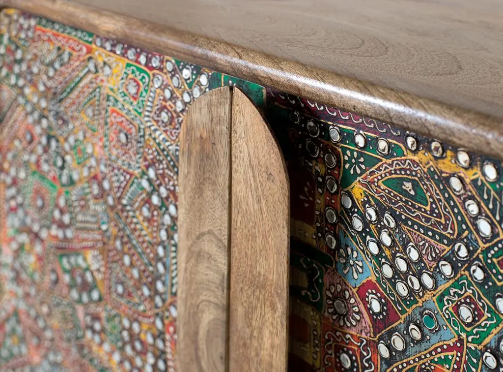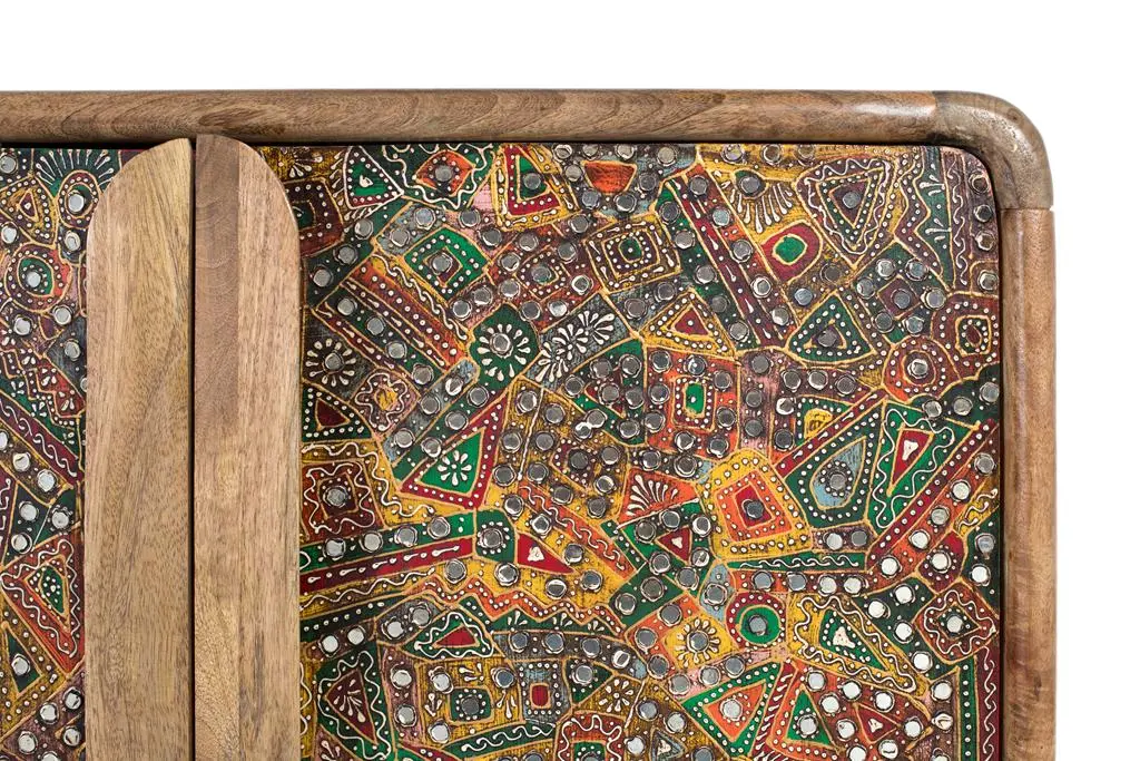 Aparador en madera de mango con acabado natural y frentes decorados con detallados motivos artesanales en tonos multicolor. Su diseño combina la calidez de la madera con un estilo étnico, ofreciendo un amplio espacio de almacenamiento y convirtiéndose en una pieza protagonista para el salón o comedor.