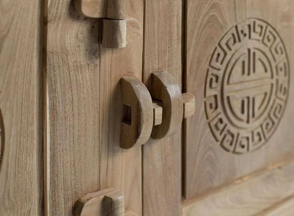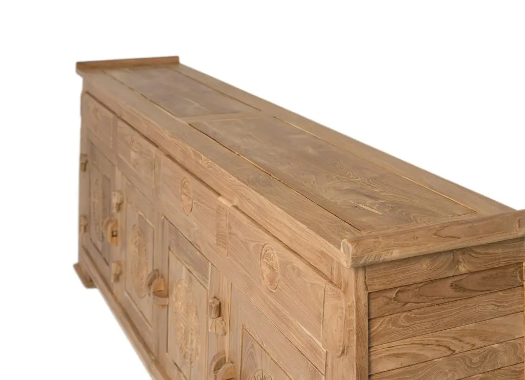 •  ESTILO.  Este aparador está elaborado en madera maciza de teca y acabado en un tono natural rústico que realza las vetas y matices propios de este material noble. Su diseño destaca por una marcada inspiración oriental.