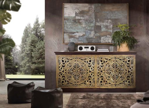 - EQUIPADO Aparador de madera maciza de mango puertas talladas a mano, trabajo artesanal con 4 puertas talladas y recubiertas con pan dorado, color nogal envejecido. El Aparador de madera ofrece un amplio espacio de almacenamiento, que es ideal para exhibir objetos decorativos, marcos de fotos o plantas, así como otros artículos.