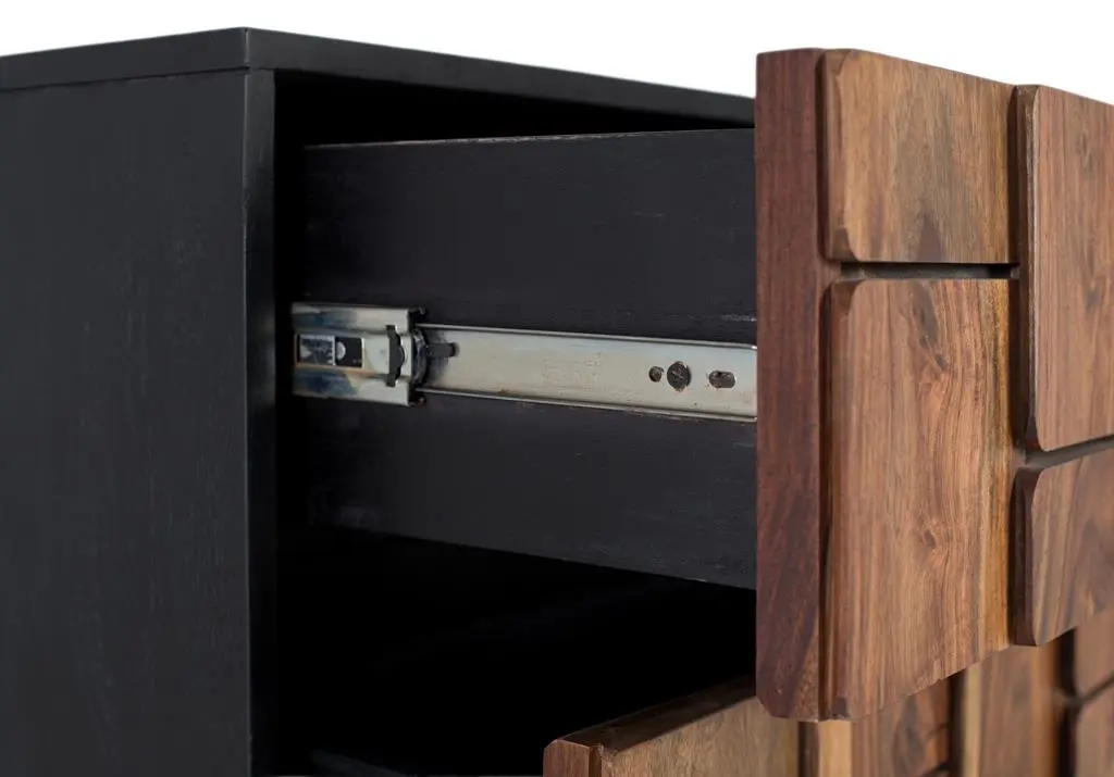 Cómoda de diseño contemporáneo con estructura y base elaboradas en madera de mango, con un elegante acabado en color wengué. El frente está compuesto por tres cajones de gran capacidad fabricados en madera de sheesham con un atractivo tono nogal, presentando un diseño en relieve formado por piezas geométricas que aportan textura y carácter al mueble.