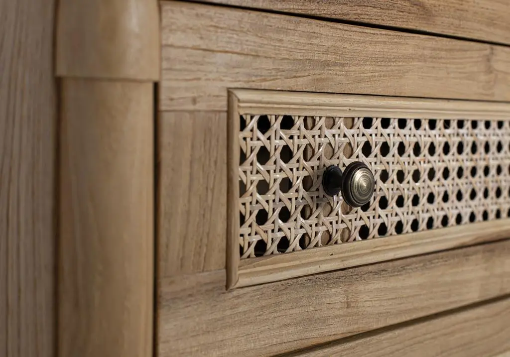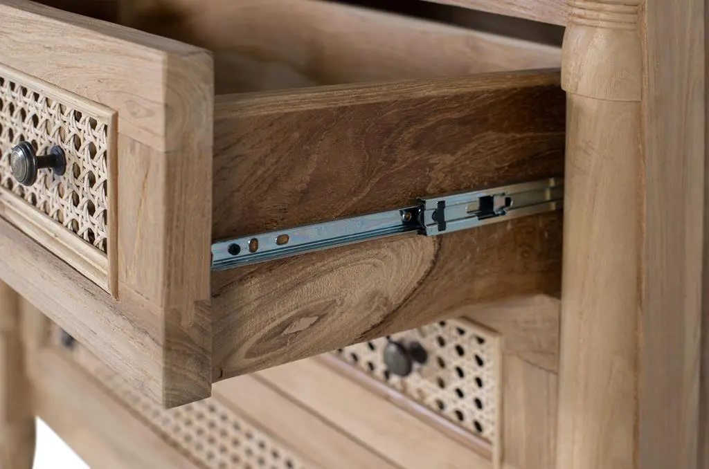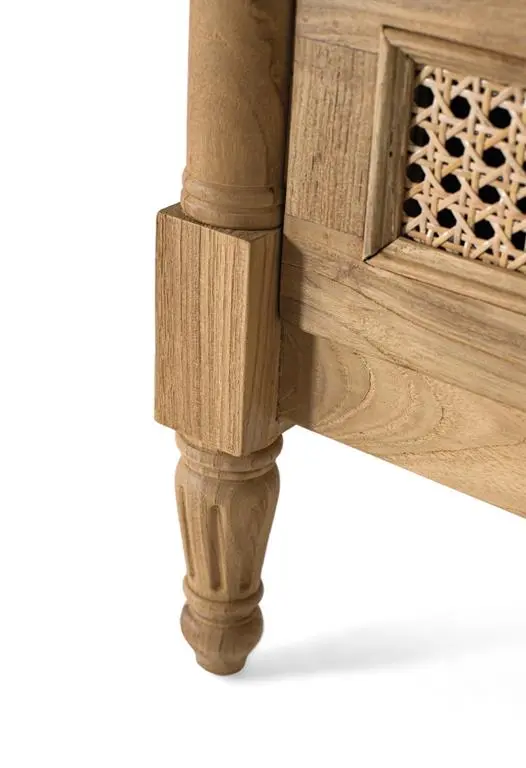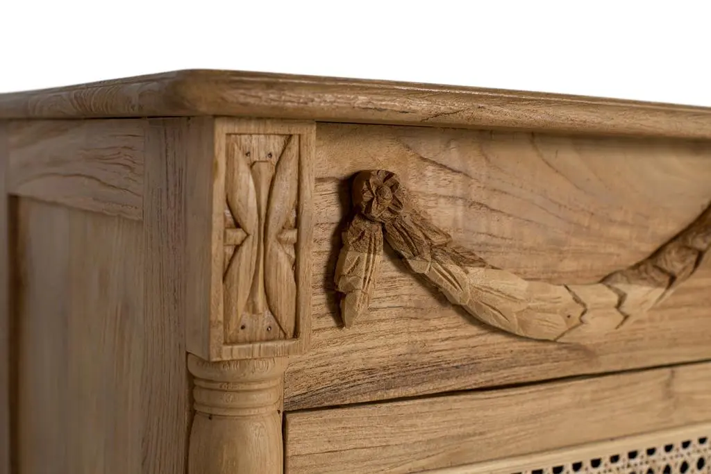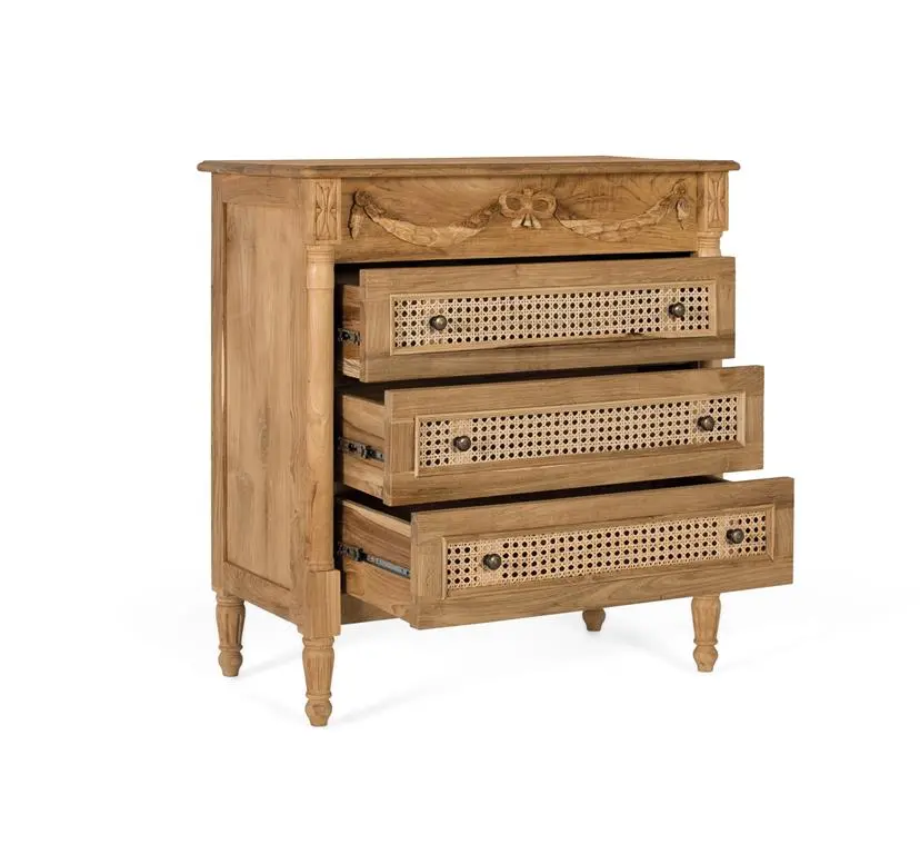 Cómoda fabricada en madera maciza de teca, con un acabado natural que realza las vetas y tonalidades de esta madera. Dispone de tres cajones amplios con frontales de rejilla trenzada de ratán, que aportan textura y ligereza visual al conjunto. La parte superior está decorada con una talla artesanal en forma de guirnalda y lazo, detalle que añade un toque romántico y refinado.Las patas torneadas completan el diseño, aportando estabilidad y un aire elegante y atemporal. Perfecta para dormitorios o salones de estilo natural, provenzal o colonial.