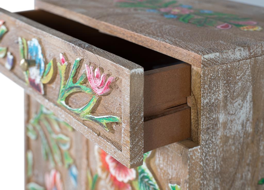 Mueble decorativo fabricado en madera de mango con acabado envejecido. Presenta un diseño floral tallado y pintado a mano en colores vivos, ideal para añadir un toque artesanal y colorido a cualquier espacio. Cuenta con un cajón funcional, perfecto como mesita de noche o mueble auxiliar en el salón o recibidor.