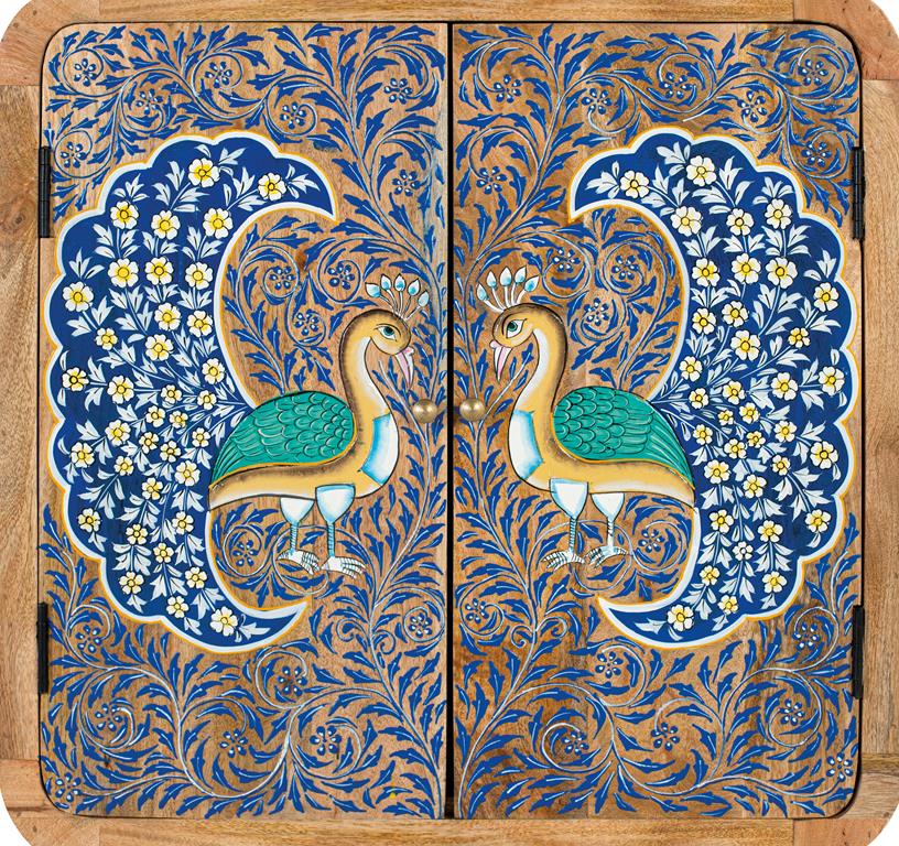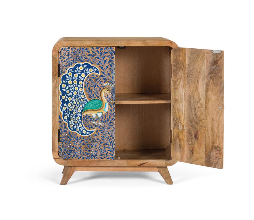 Mueble de madera maciza de mango con diseño artesanal. Su estructura robusta y esquinas redondeadas le dan un estilo moderno con aire retro. Las puertas están decoradas con un llamativo motivo de pavos reales en tonos azul, verde y dorado, rodeados de detalles florales sobre fondo índigo. Ideal como pieza decorativa y funcional para salones, entradas o dormitorios, encaja perfectamente en ambientes bohemios, étnicos o contemporáneos.