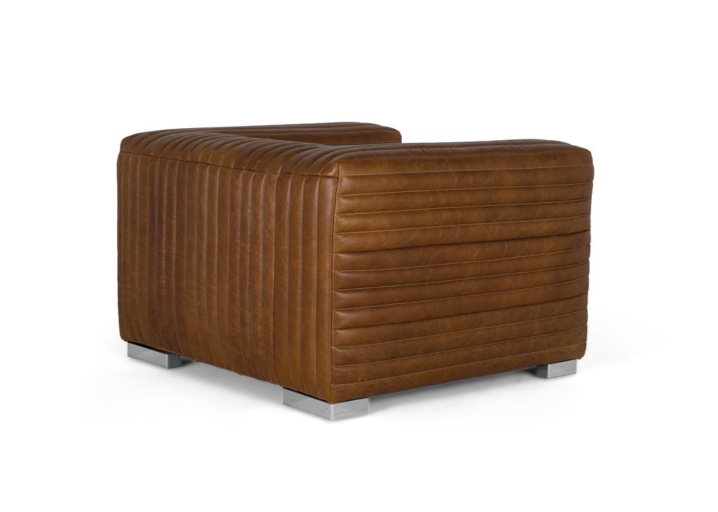 • Diseño:  Este sillón se distingue por su diseño moderno y robusto, tapizado en cuero de alta calidad que ofrece un tacto suave y una gran durabilidad. Su acabado presenta un elegante patrón acolchado con costuras verticales. La estructura cúbica y envolvente brinda comodidad y firmeza