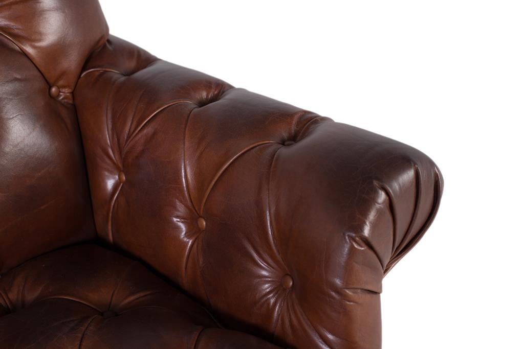 - Diseño: Este elegante sillón destaca por su tapizado en piel marrón oscuro de gran calidad, realzado con un refinado acabado en capitoné que aporta carácter y un estilo clásico atemporal. Su respaldo alto y brazos generosos ofrecen comodidad.