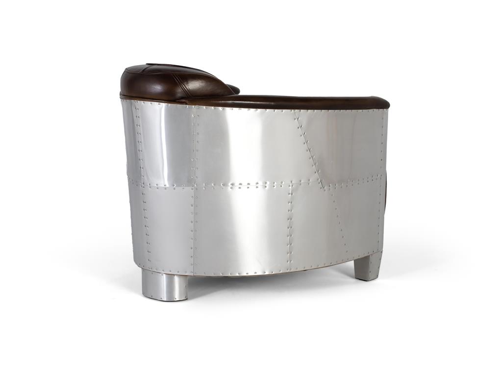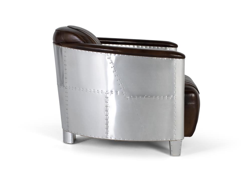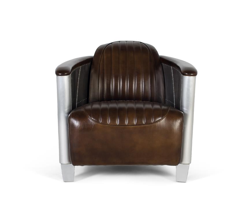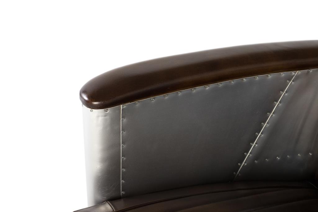 Inspirado en el diseño industrial y la estética aeronáutica, este impresionante sillón de 1 plaza estilo Aviator combina elegancia vintage con materiales de carácter fuerte. Tapizado en piel marrón de aspecto envejecido, ofrece una superficie suave, resistente y cómoda, con costuras verticales que evocan los clásicos asientos de los automóviles y aeronaves de mediados del siglo XX. Los laterales curvados y el respaldo están recubiertos con paneles de aluminio remachado, pulido a mano, que imita el estilo de fuselaje de avión. Este detalle metálico no solo añade un impacto visual distintivo, sino que también realza el estilo industrial-retro del conjunto.