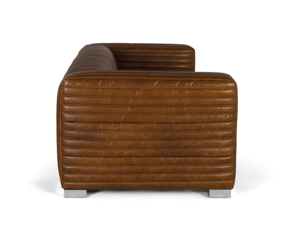 Este sofá de 3 plazas se distingue por su diseño moderno y robusto, tapizado en cuero de alta calidad que ofrece un tacto suave y una gran durabilidad. Su acabado presenta un elegante patrón acolchado con costuras verticales. La estructura cúbica y envolvente brinda comodidad y firmeza. Sus patas de acero inoxidable aportan estabilidad, resistencia y un contraste sofisticado con la calidez del cuero.