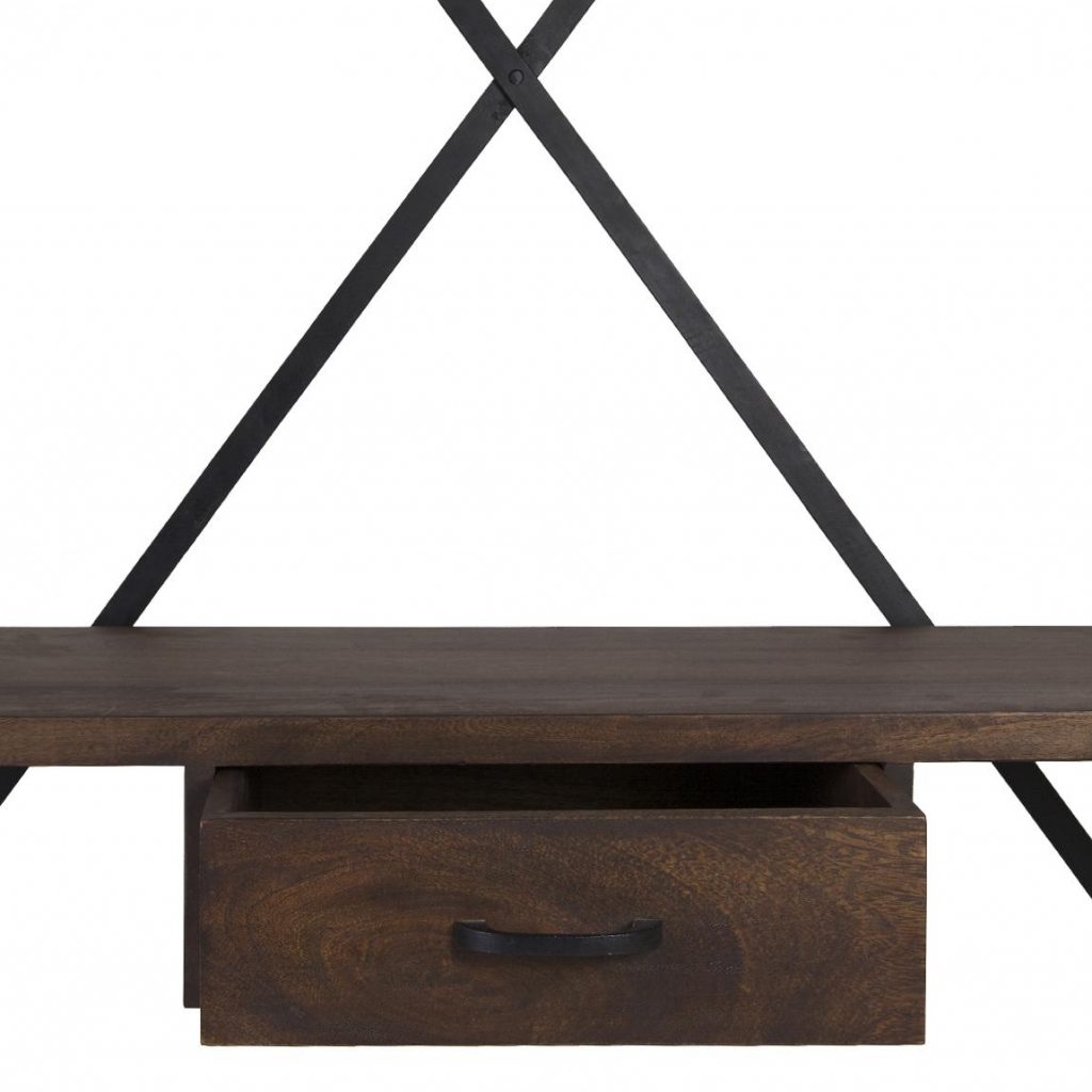 - EQUIPADO Colgadorde madera maciza de mango y pies de hierro 1 cajón barra para colgar ropa y 2 estantes inferior, color nogal envejecido con detalles en color negro envejecido.